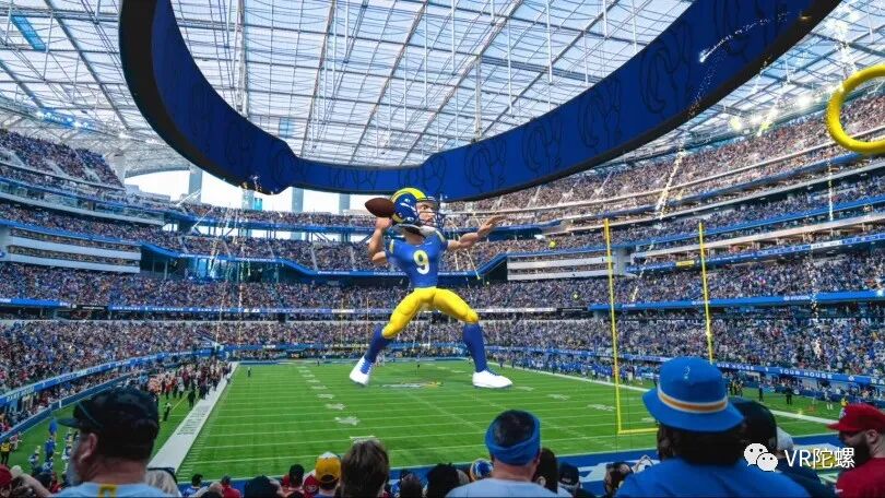 在比赛过程中,当球队登场、球员触地得分等情况时,球迷可以在体育场7万平方英尺的巨大环形屏幕上看到多种AR特效。