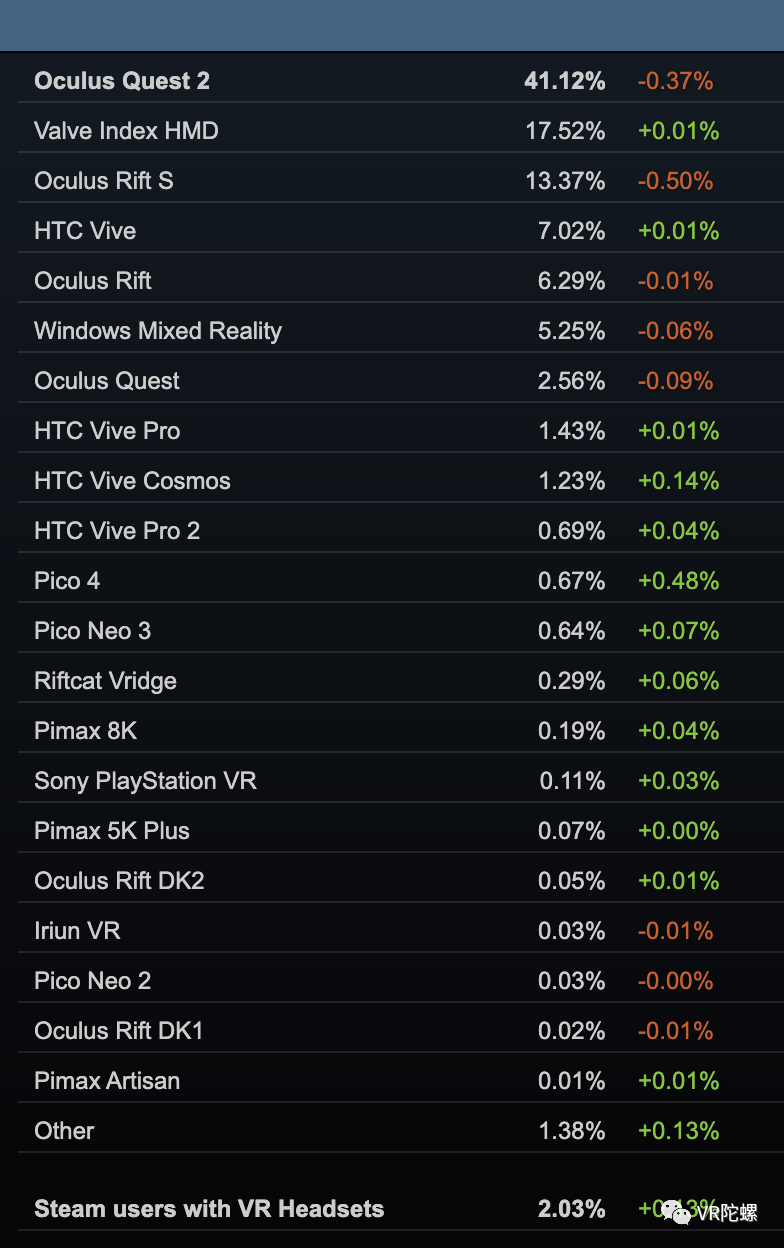 参考其他品牌设备,VR 设备使用率几乎都在呈现下滑趋势,特别是位于前排位置的 Oculus Quest 2、Oculus Rift S、环比下跌幅度分别达到了 0.37% 和 5%。