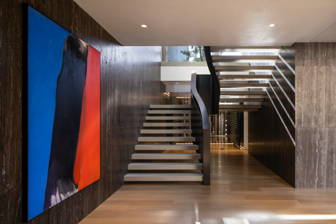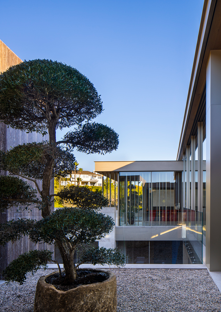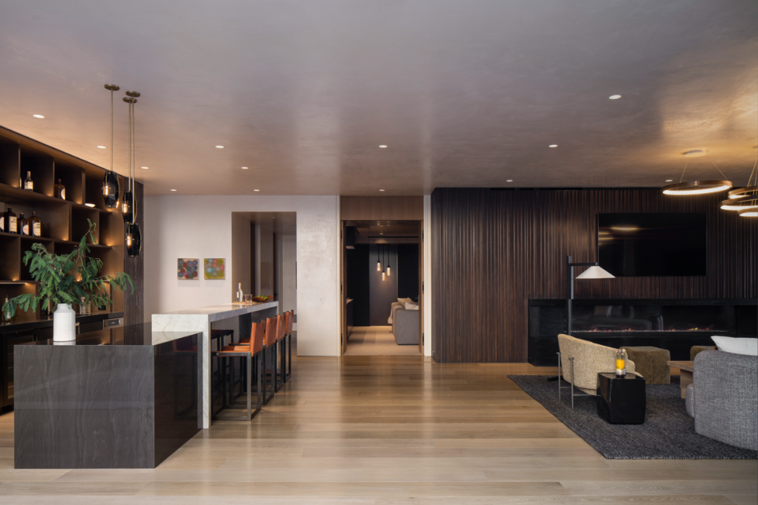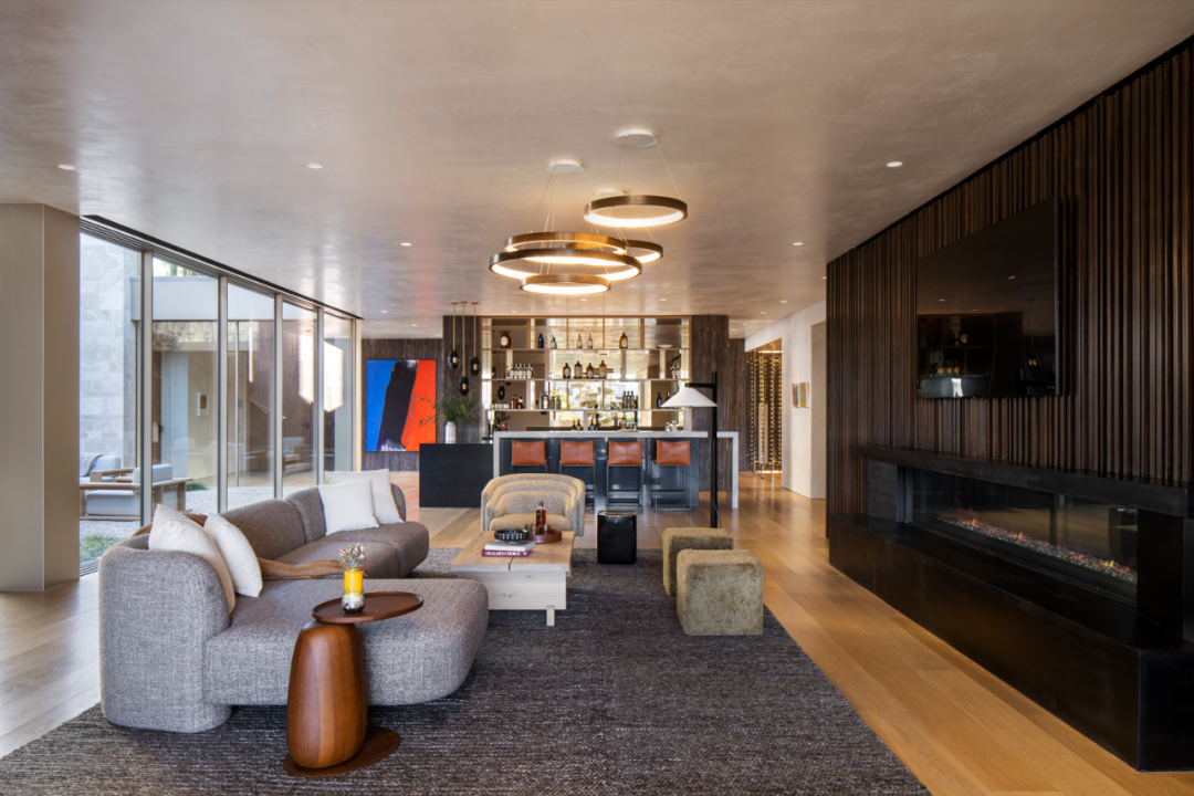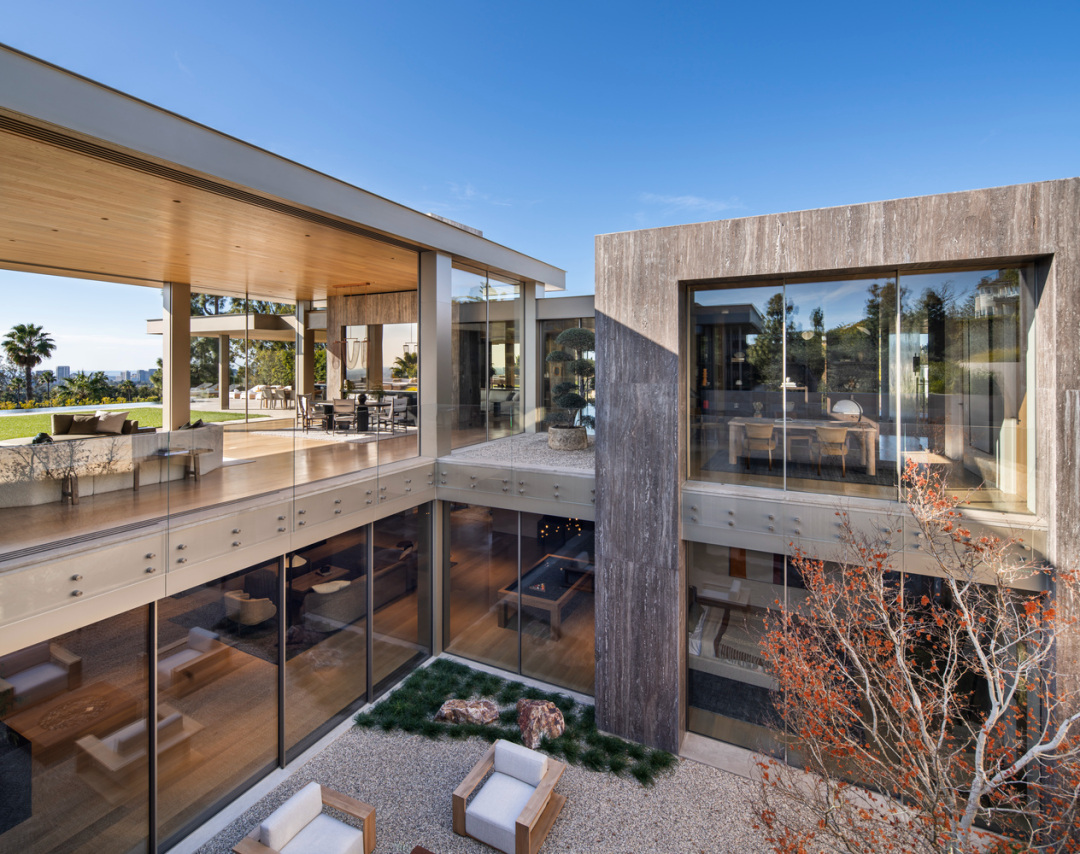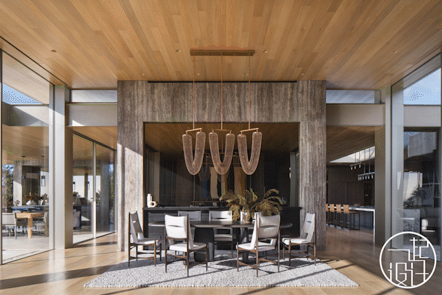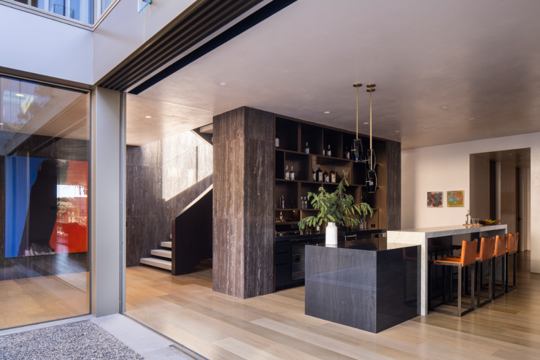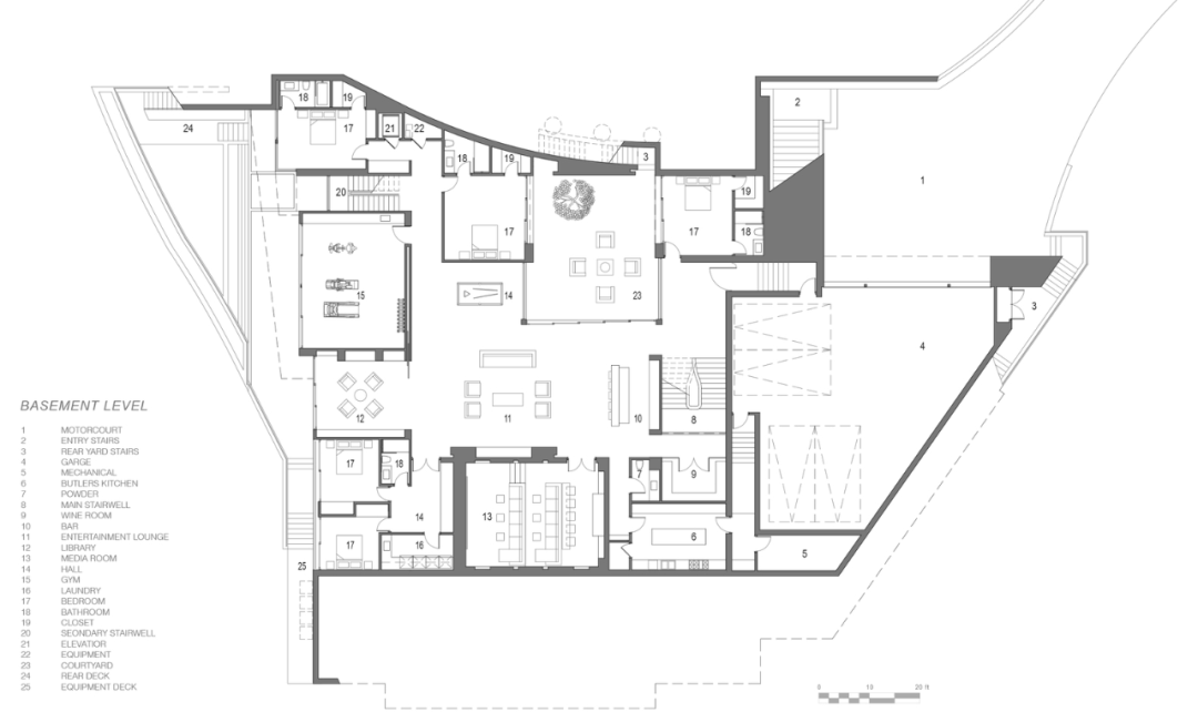 下层作为娱乐区,其以中央庭院为中心,设有一个健身房、酒吧、影音室、服务厨房和三个额外的卧室。