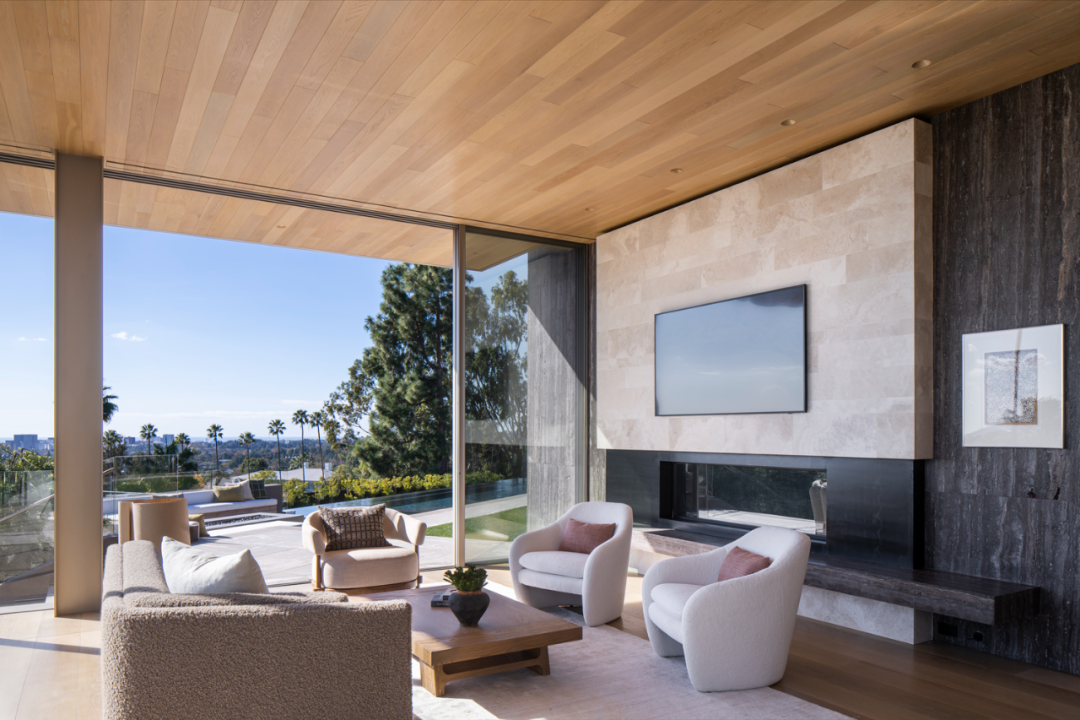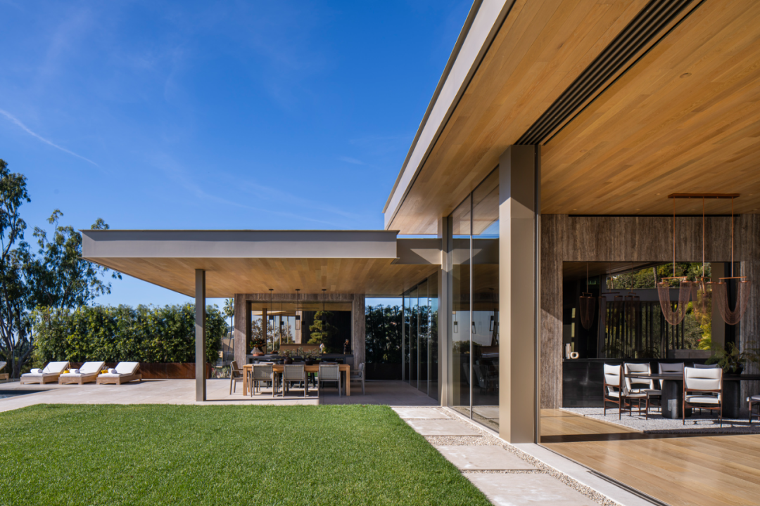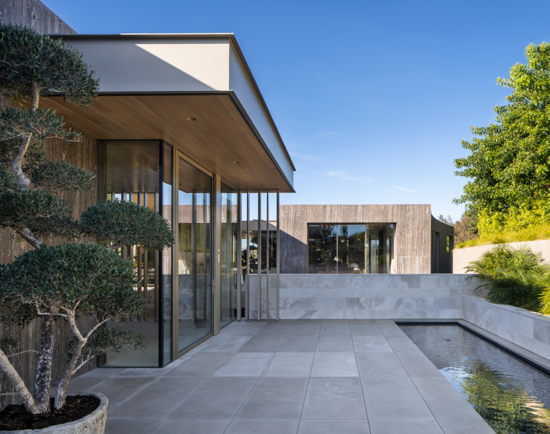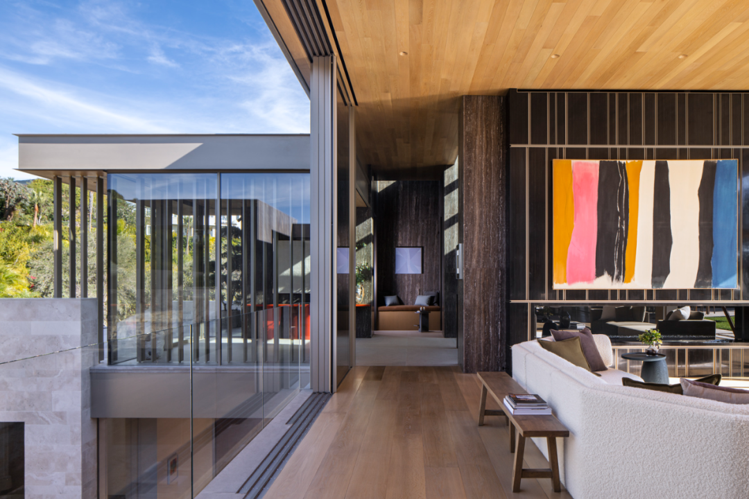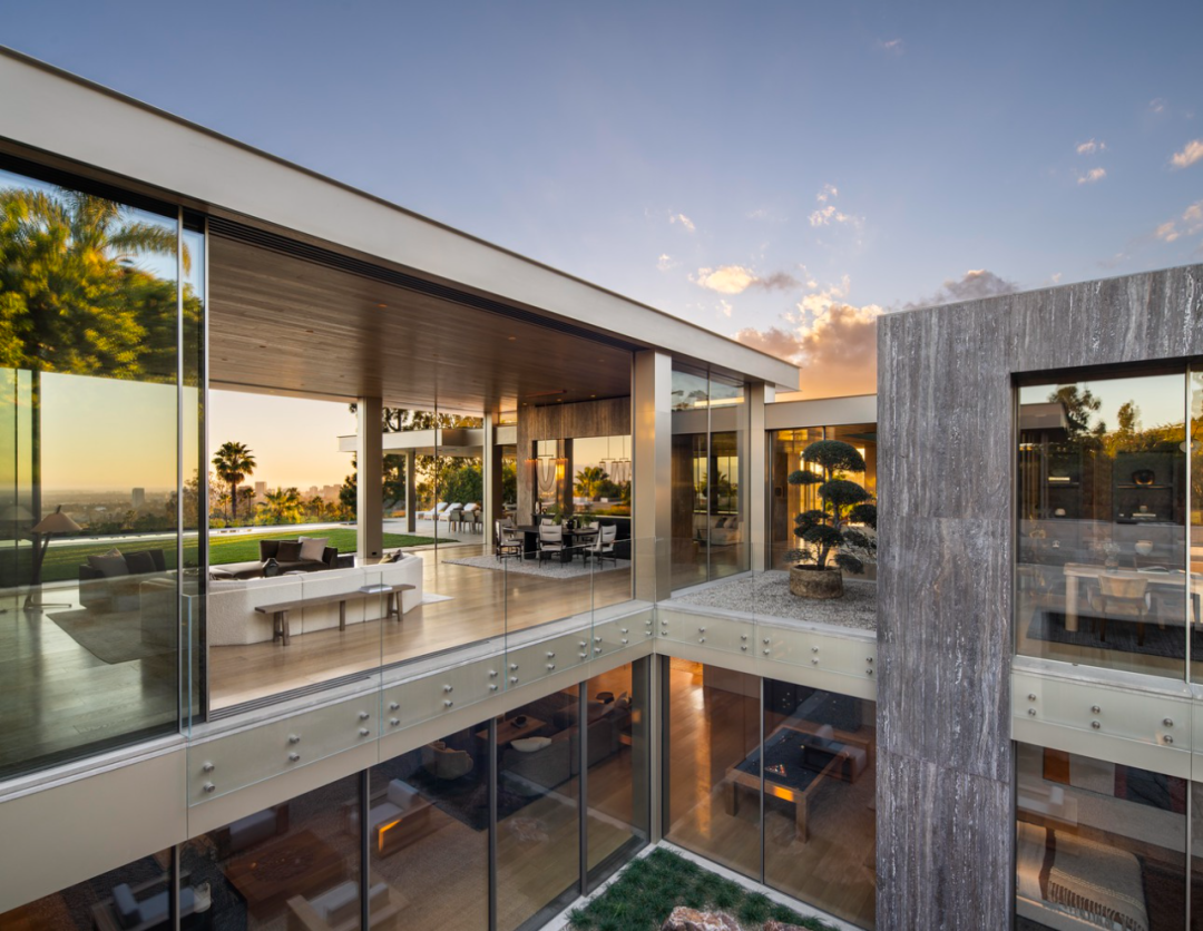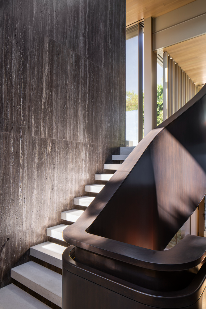 下层作为娱乐区,其以中央庭院为中心,设有一个健身房、酒吧、影音室、服务厨房和三个额外的卧室。