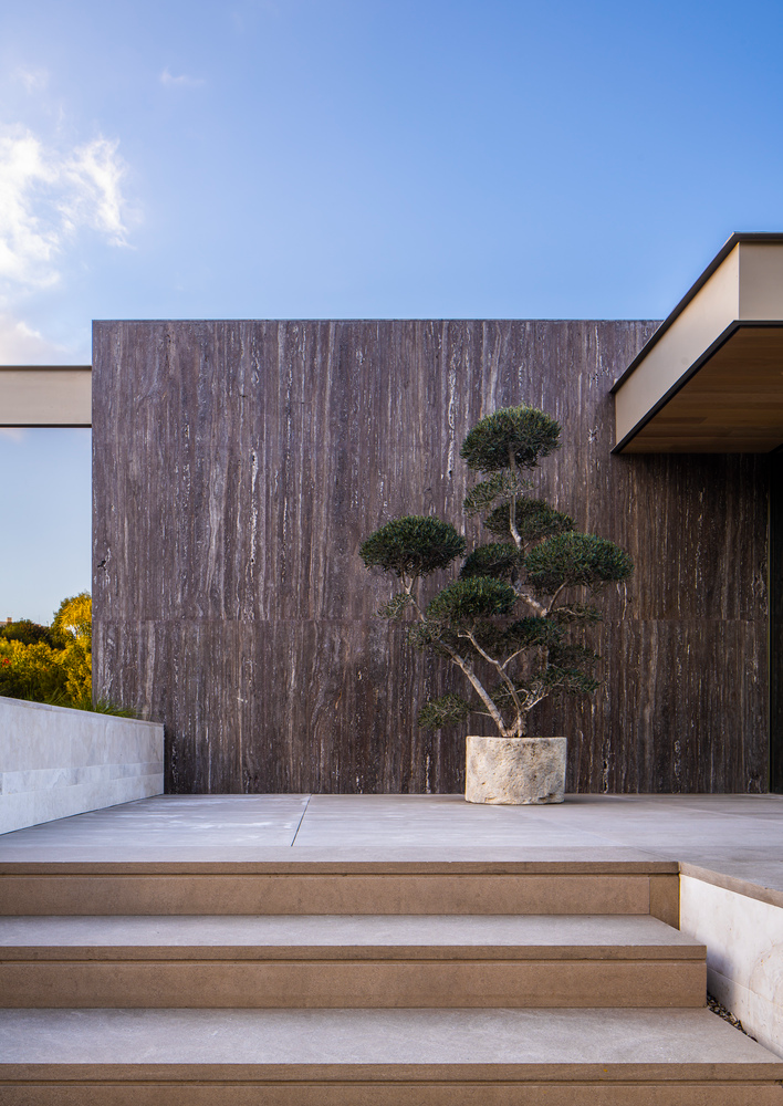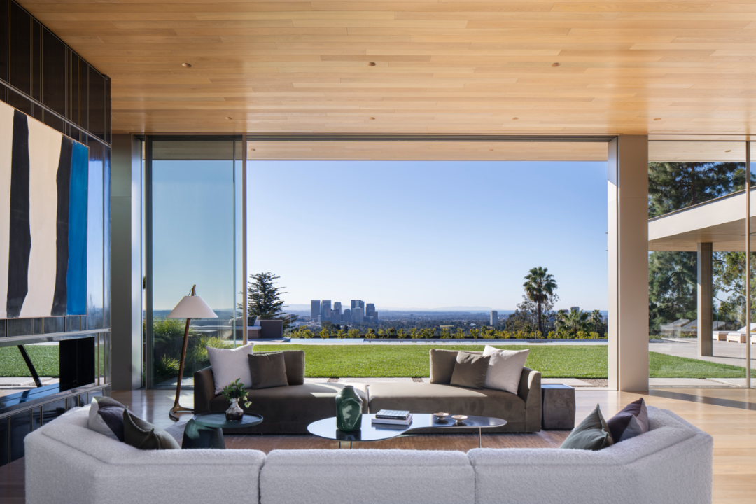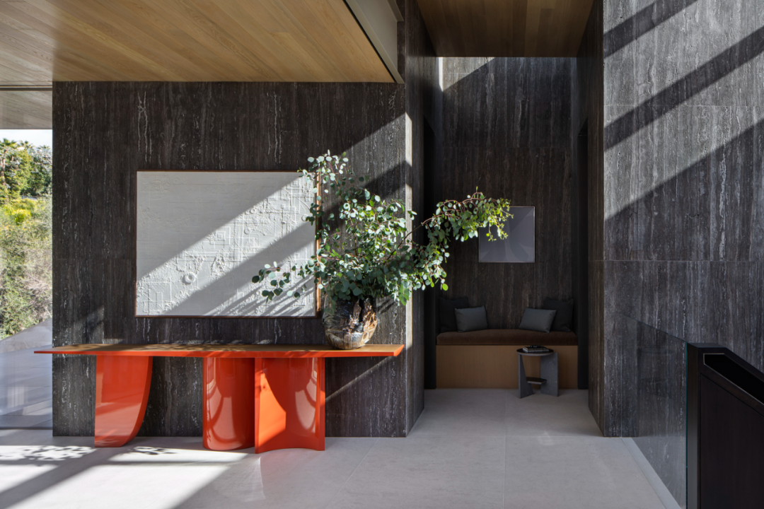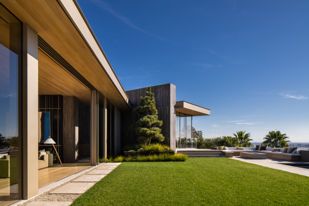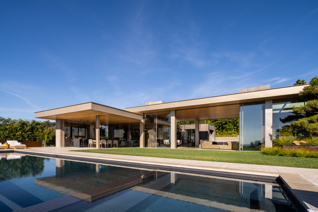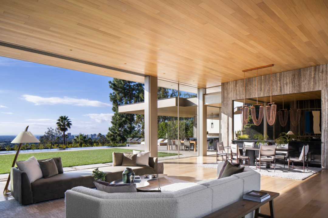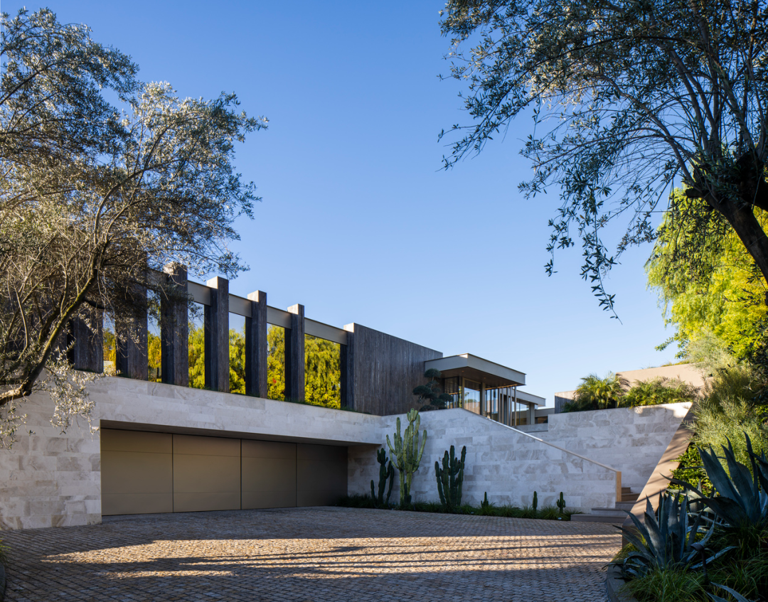 下层作为娱乐区,其以中央庭院为中心,设有一个健身房、酒吧、影音室、服务厨房和三个额外的卧室。
