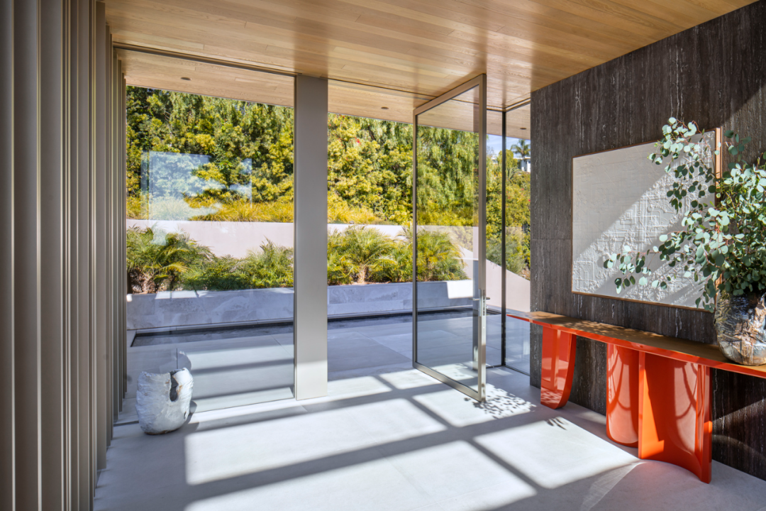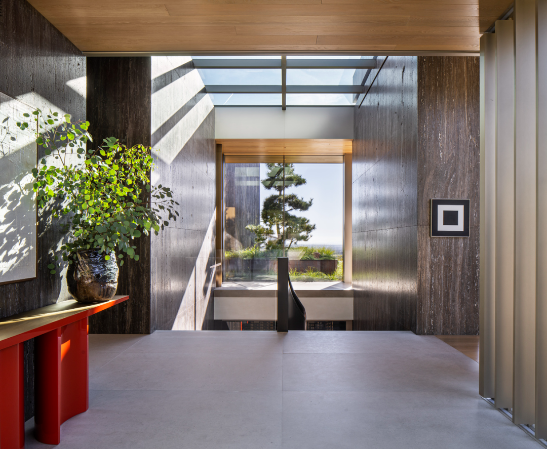 进入室内,玄关设计令人印象深刻,玻璃单轴旋转门正对一扇采光窗,顶部的天窗设计,不仅拥有极佳的采光也使视线穿透建筑,令空间更加开阔。
