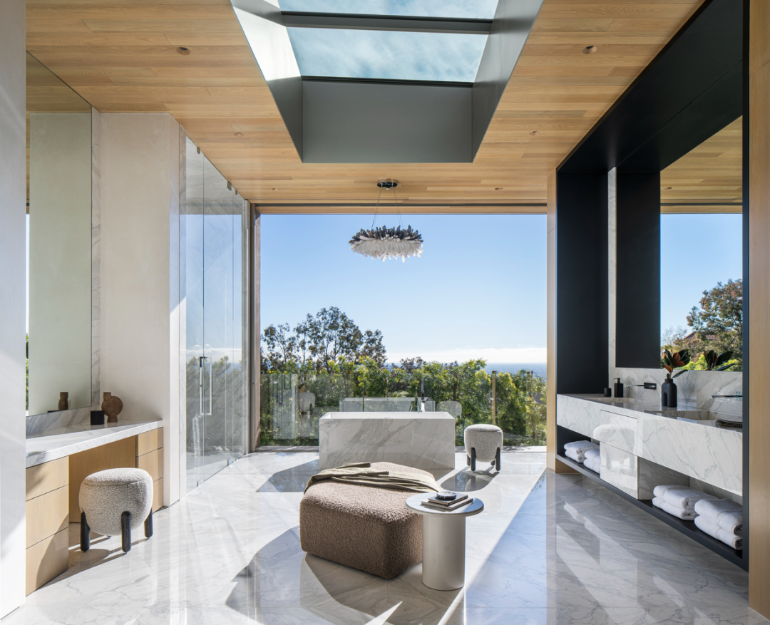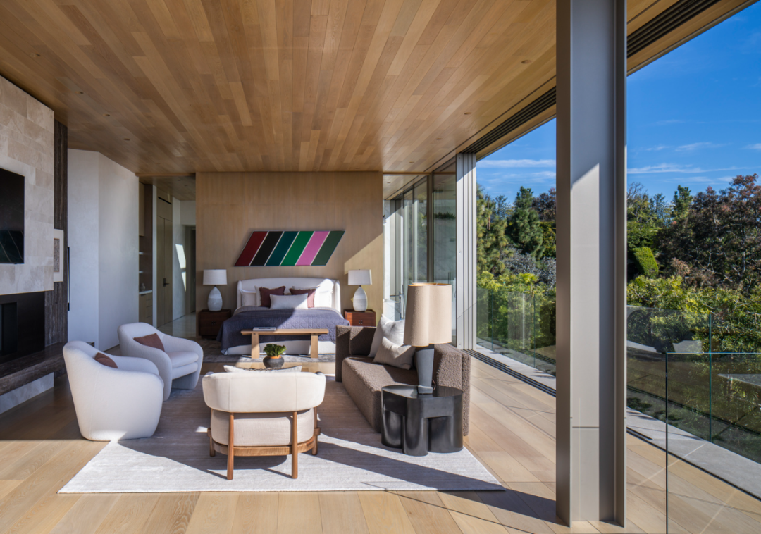 卧室内还带有一个小型客厅,非常适合放松身心,环绕四周的大面积玻璃落地窗,将自然光线充分引入,也让人躺着就能欣赏到周围的美景。