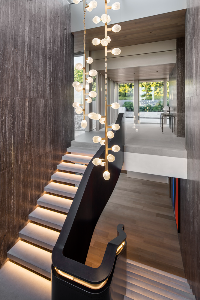 楼梯顶部装有金属球形吊灯,既能起到空间照明,又能进一步增强了楼梯的美感。