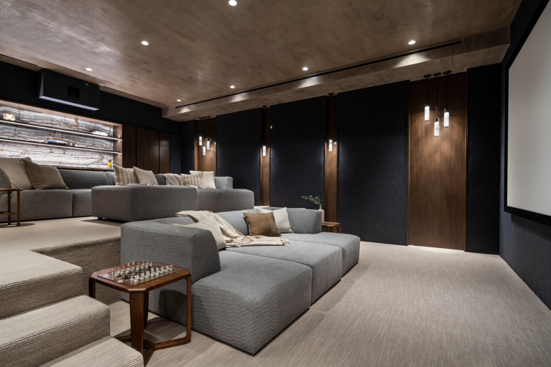 影音室内拥有舒适的沙发座椅,并以黑色的墙面为背景。阶梯形态的布置也更适合观看屏幕。