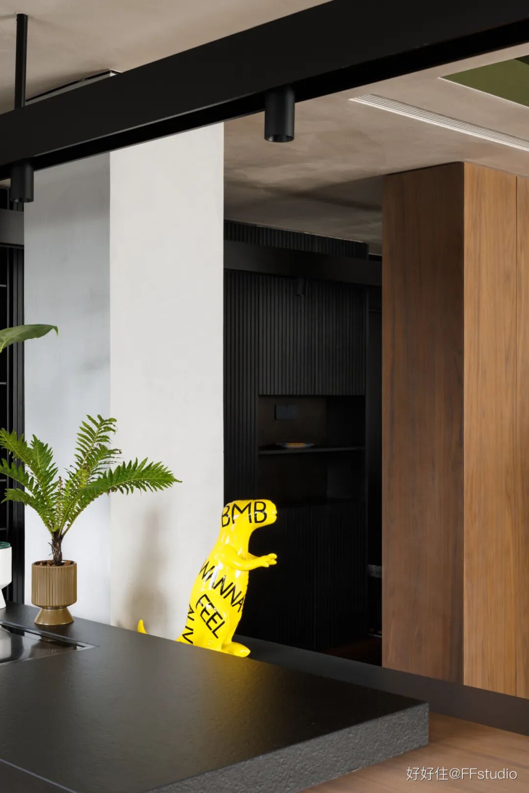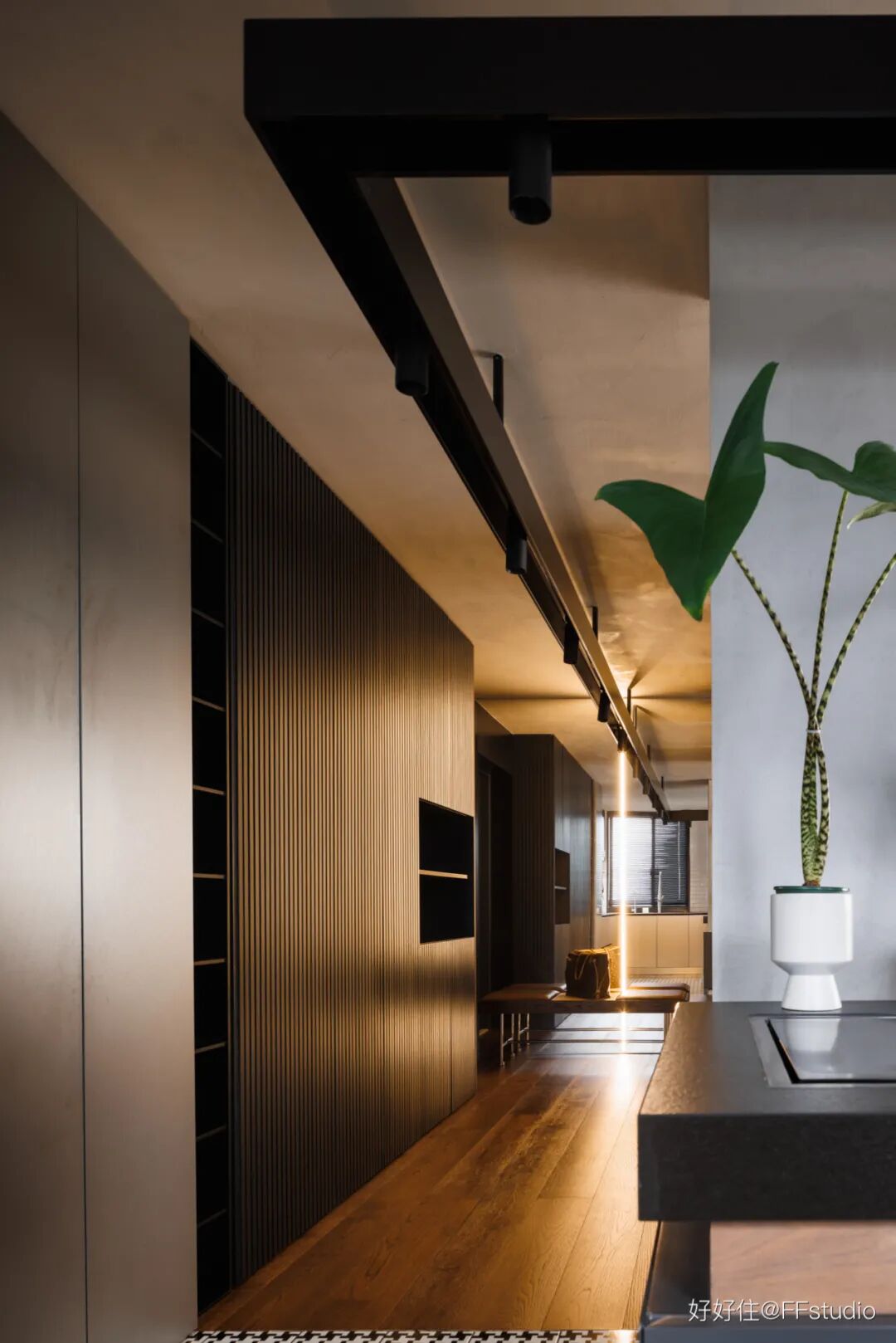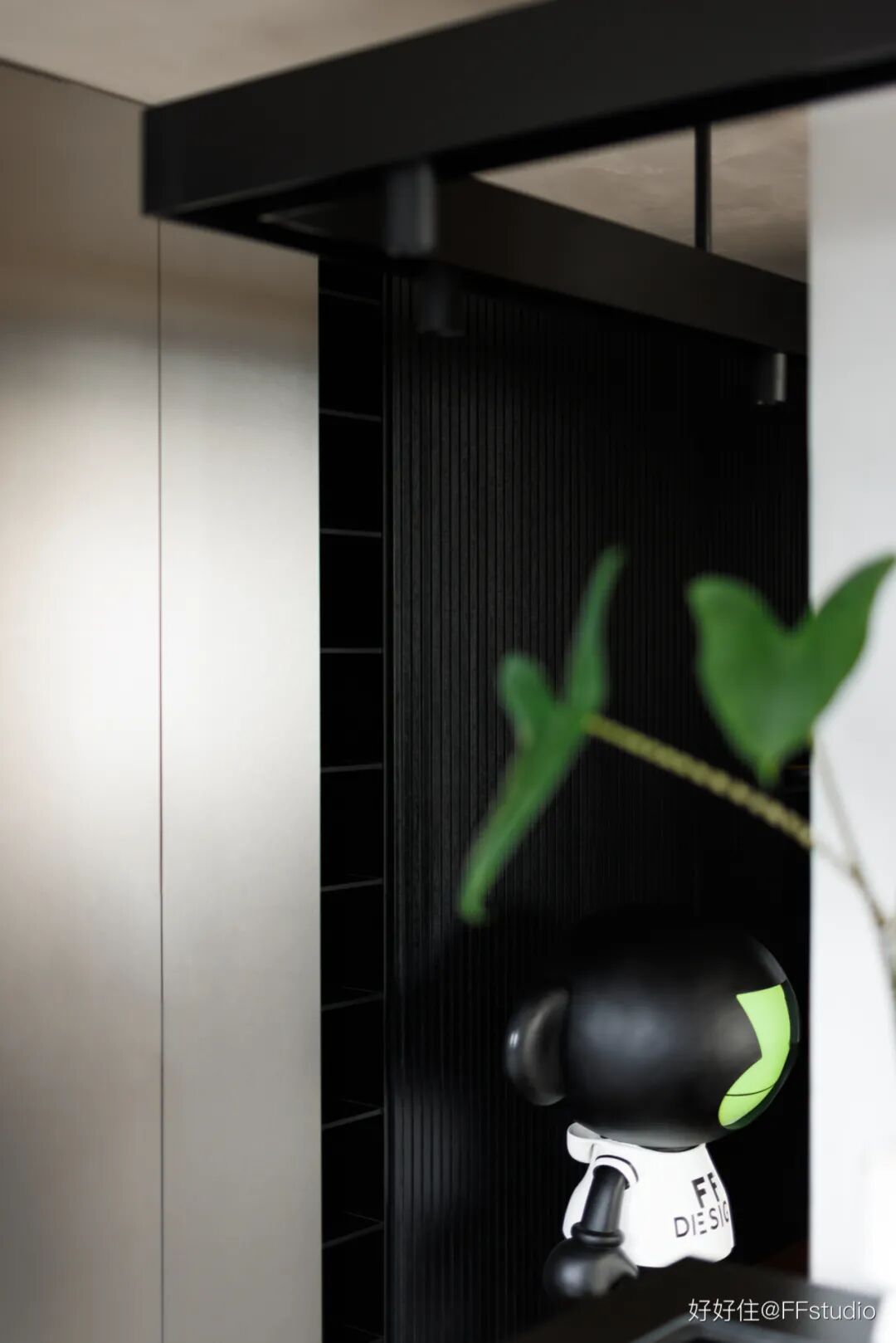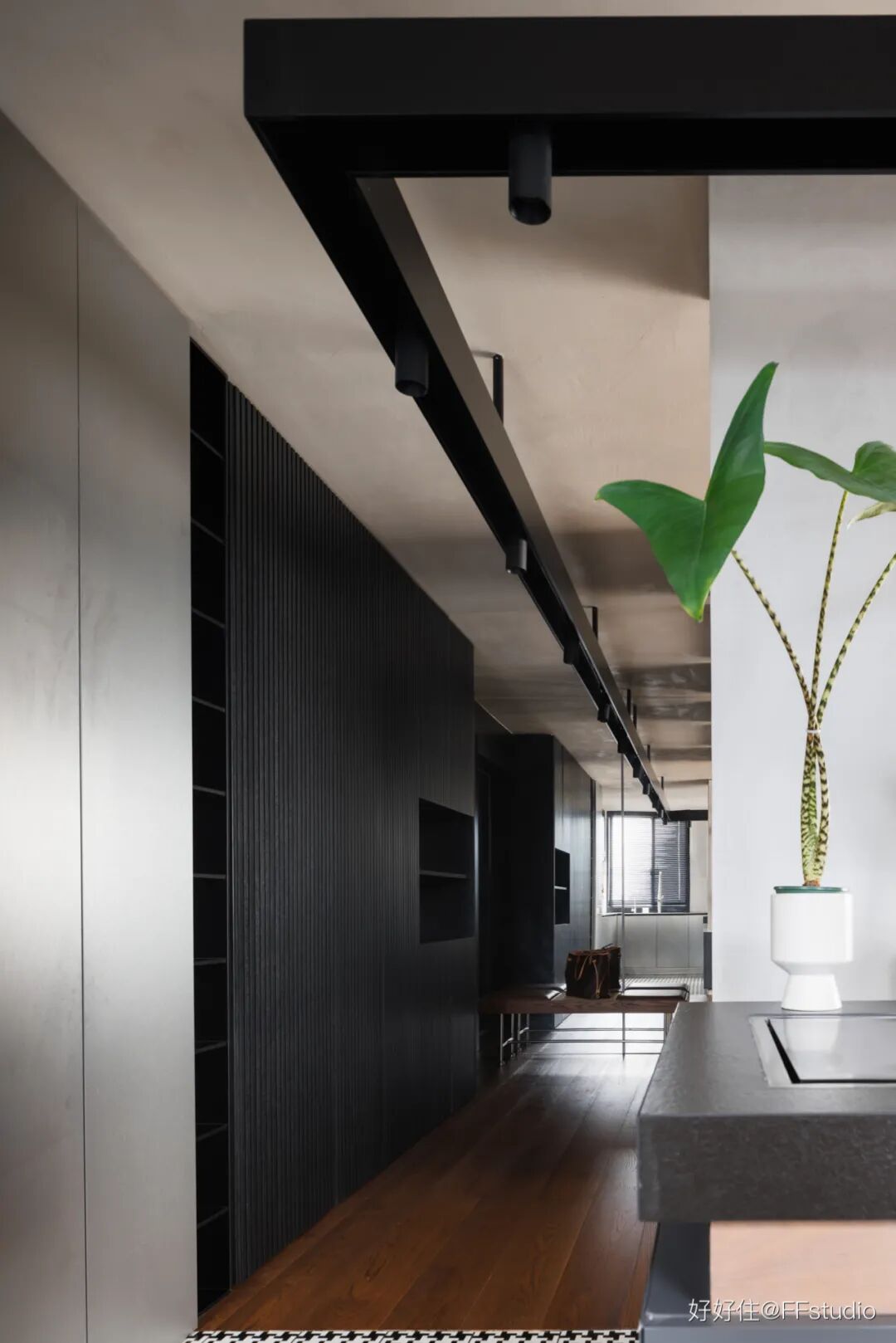 FFstudio:走道一侧的墙面,则做了一组顶天立地的玄关柜,延伸到厨房,也让玄关变得非常实用。黑色的柜体在视觉上也比较有质感。玄关这边的照明,则用了一个明装的灯轨,一直延伸到餐厅,顶面是艺术漆,整个呈现又会有一些工业风的味道。