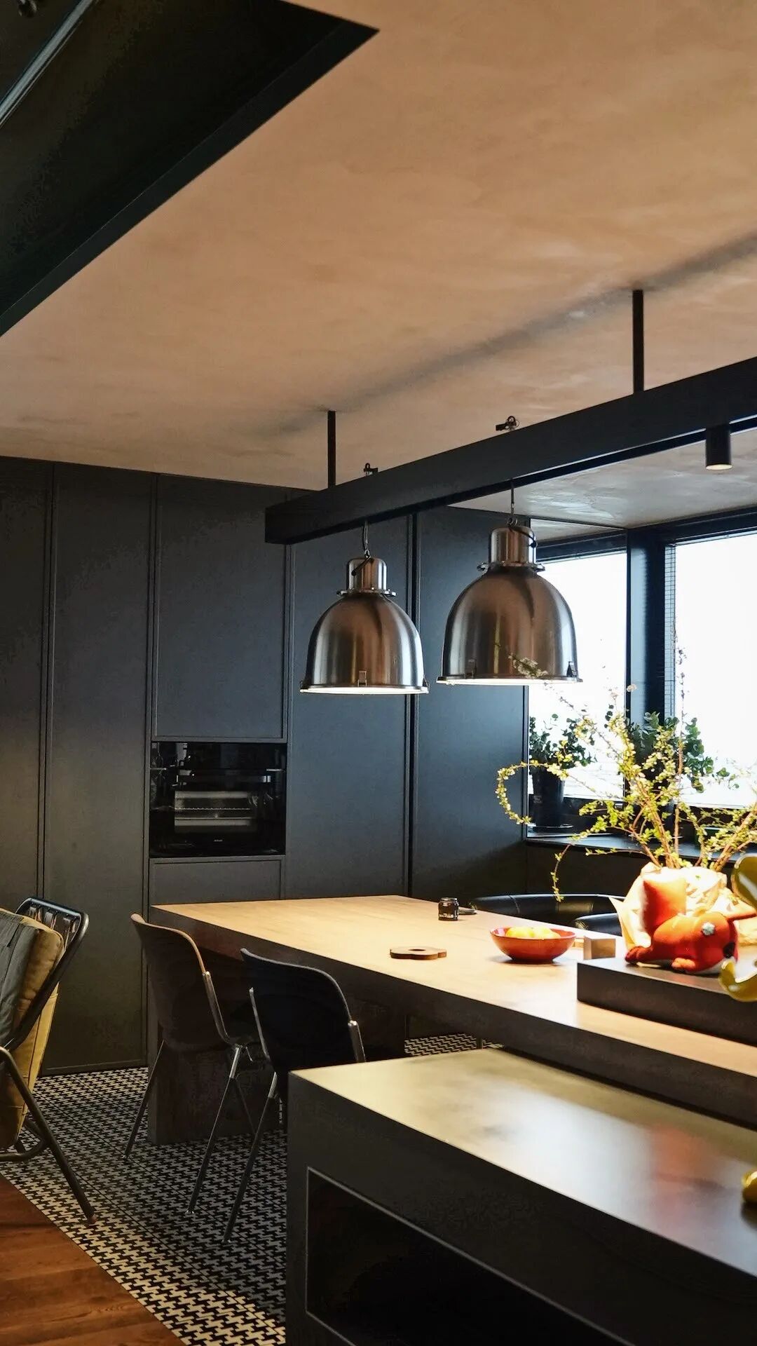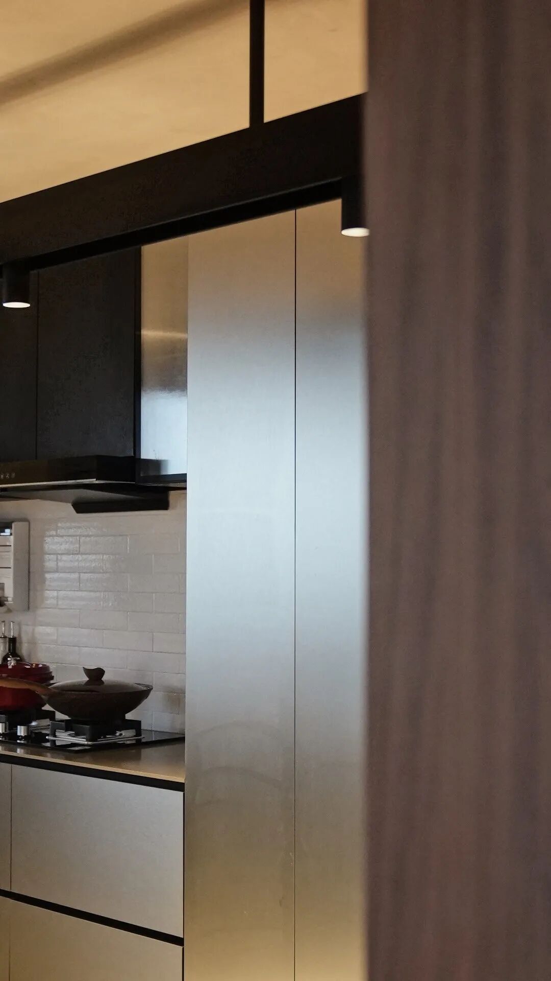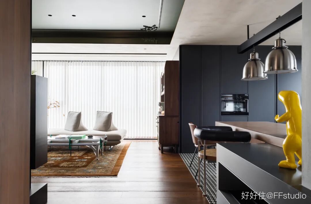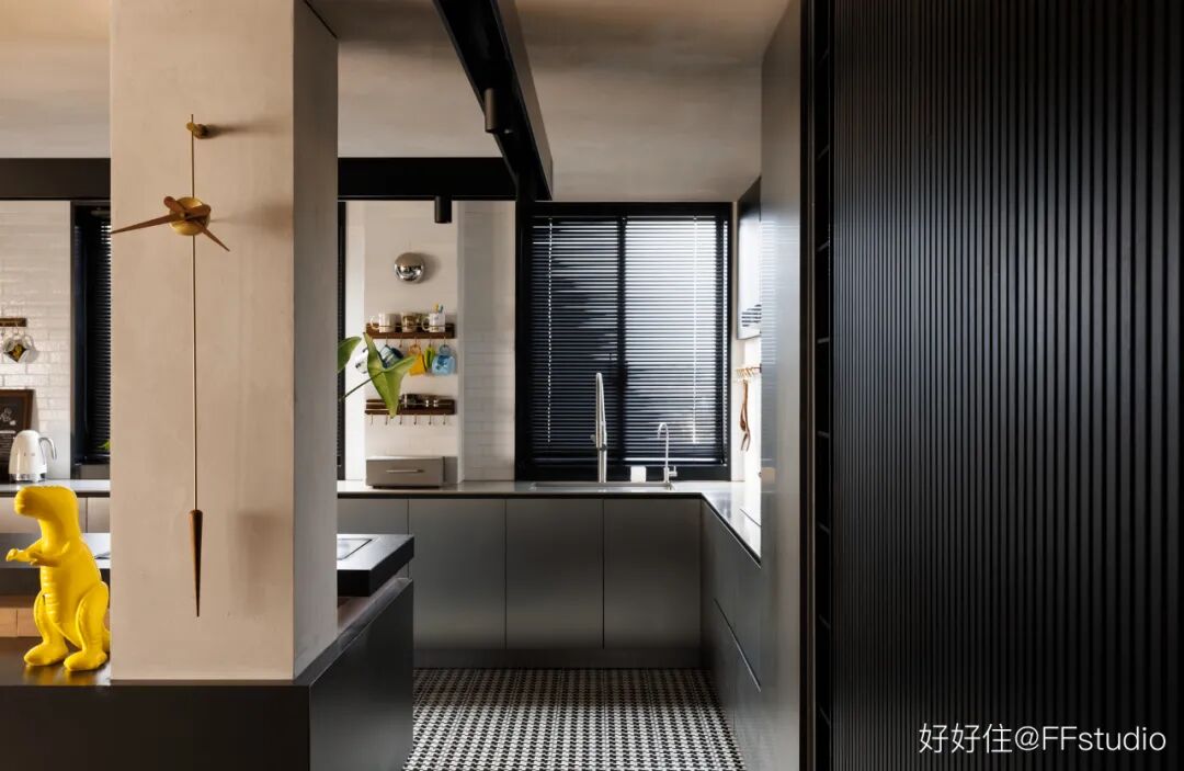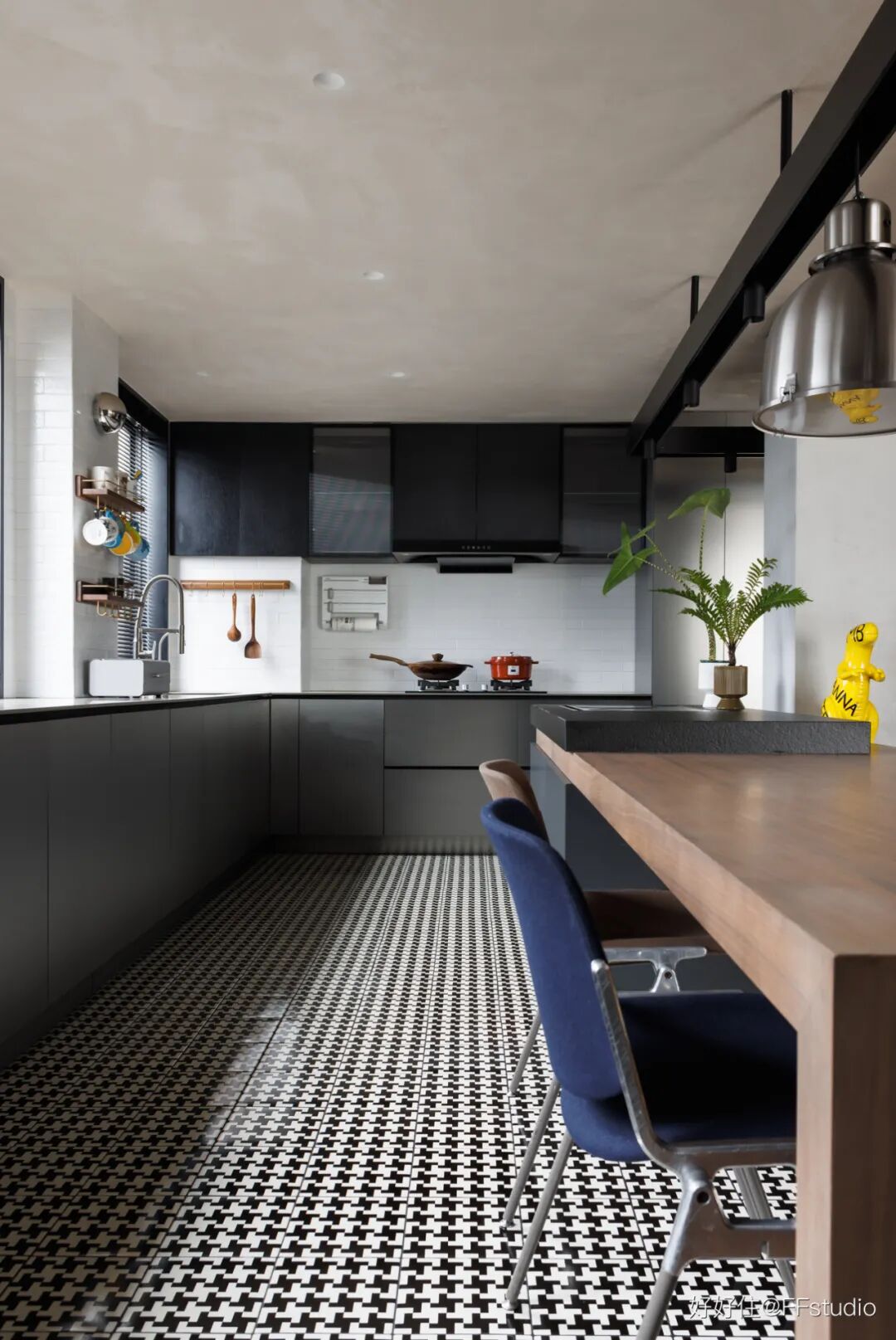 FFstudio:走道一侧的墙面,则做了一组顶天立地的玄关柜,延伸到厨房,也让玄关变得非常实用。黑色的柜体在视觉上也比较有质感。玄关这边的照明,则用了一个明装的灯轨,一直延伸到餐厅,顶面是艺术漆,整个呈现又会有一些工业风的味道。
