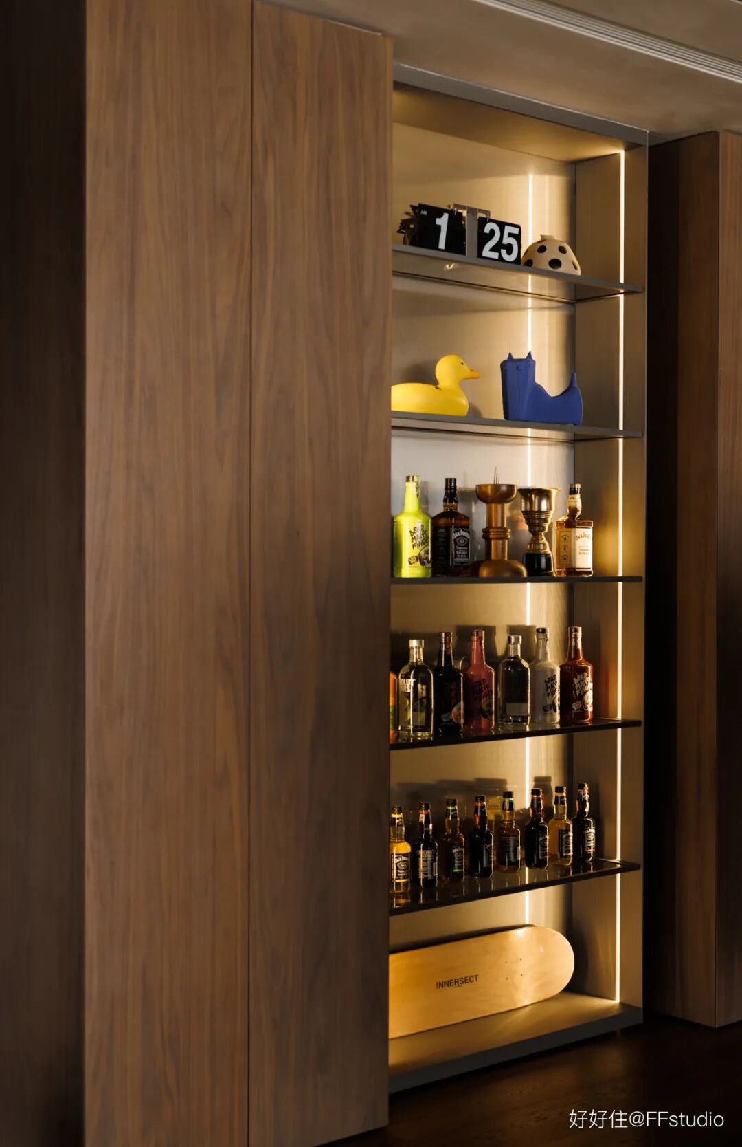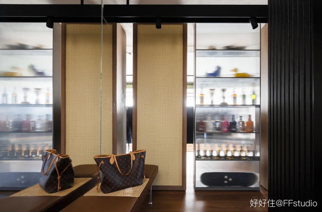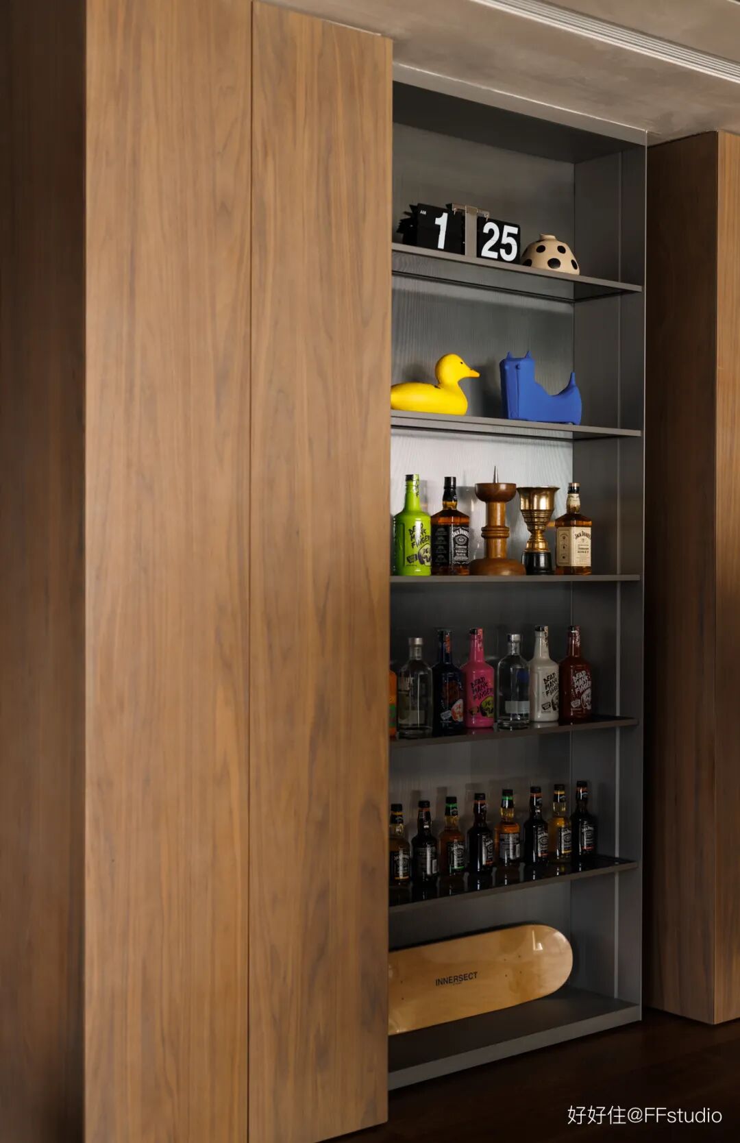FFstudio:玄关隔断在玄关区是没有收纳功能的,但是我把这部分空间也充分利用起来,在它的背面做了开放式酒架和收纳柜,面向客厅,也形成家里的一道景观。