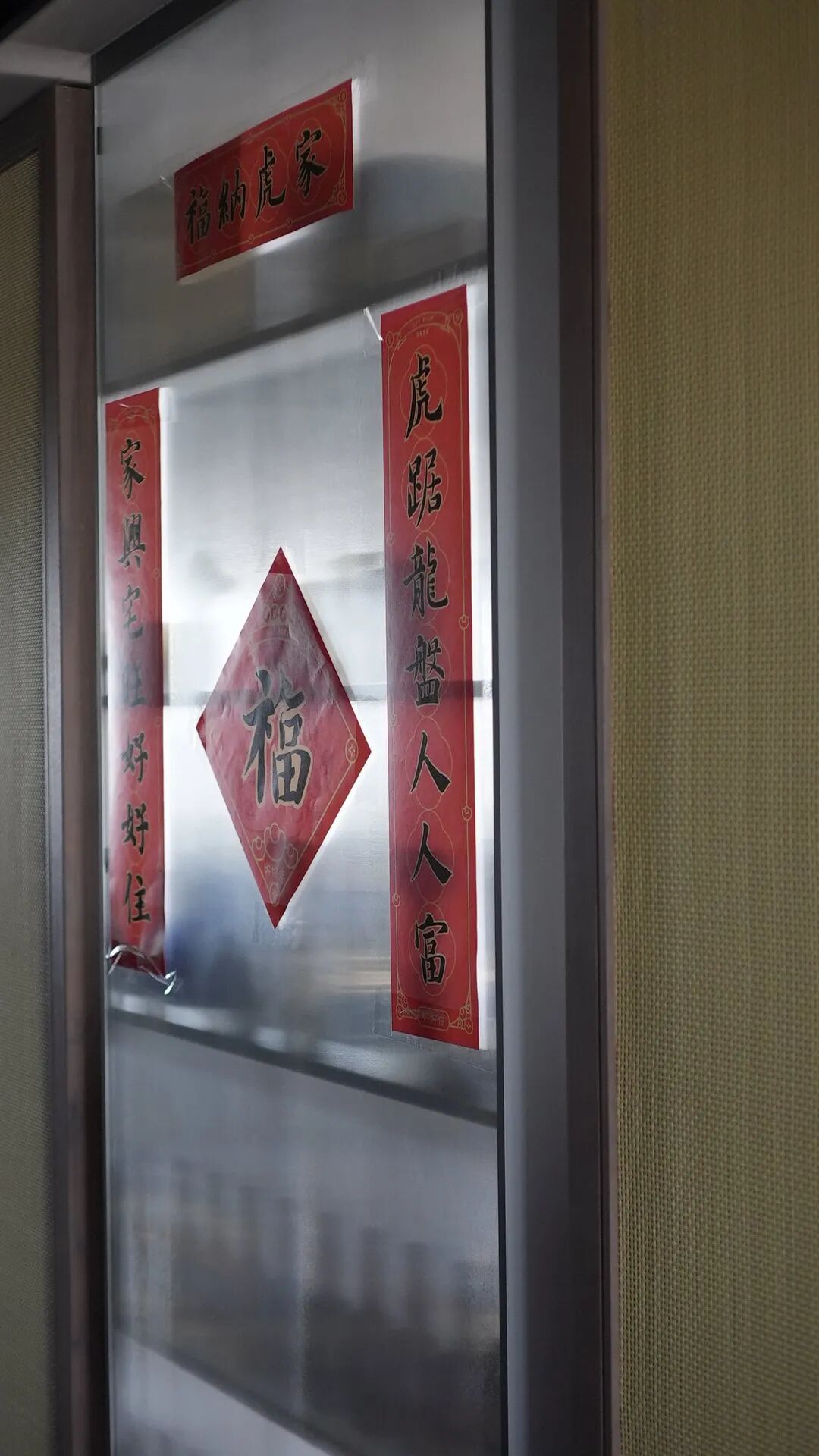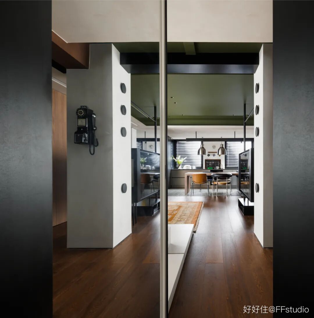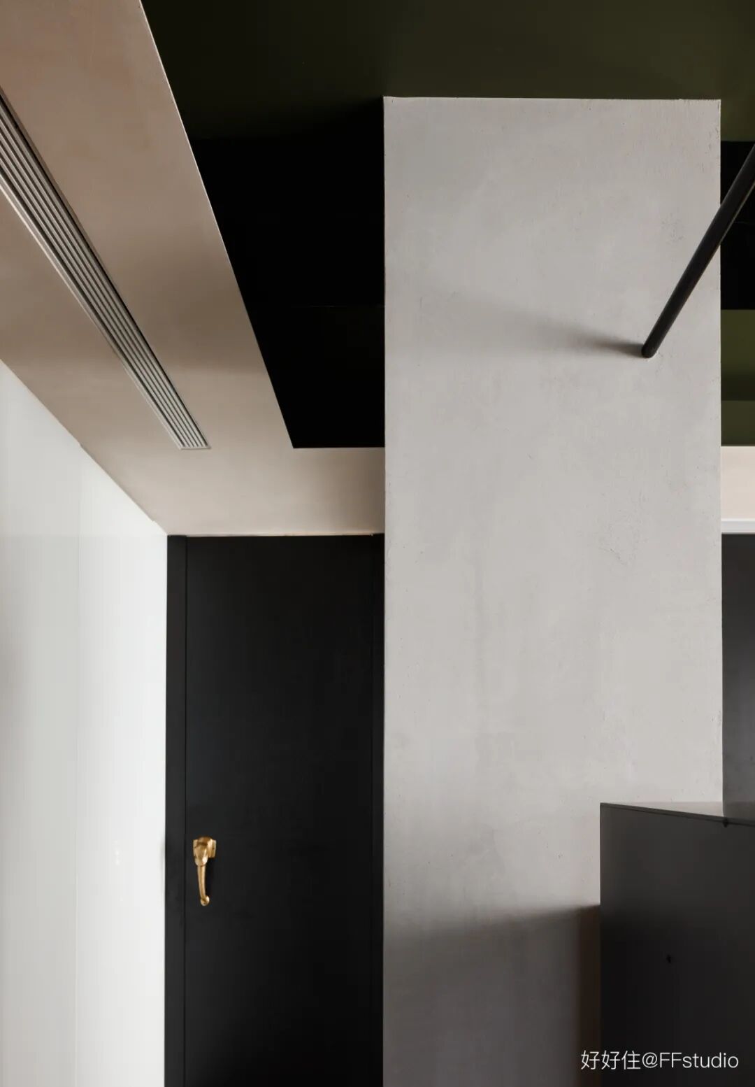 FFstudio:我爸妈的房间在电视墙柱子靠近玄关那边,原本就一扇黑色的隐形门做入口,但是我买了一个很好看的黄铜象头把手,就给他们装上了。从他们房间看出来,可以看到嵌入中岛的壁炉,这边的通道就是在电视墙和玄关隔断中间的位置。