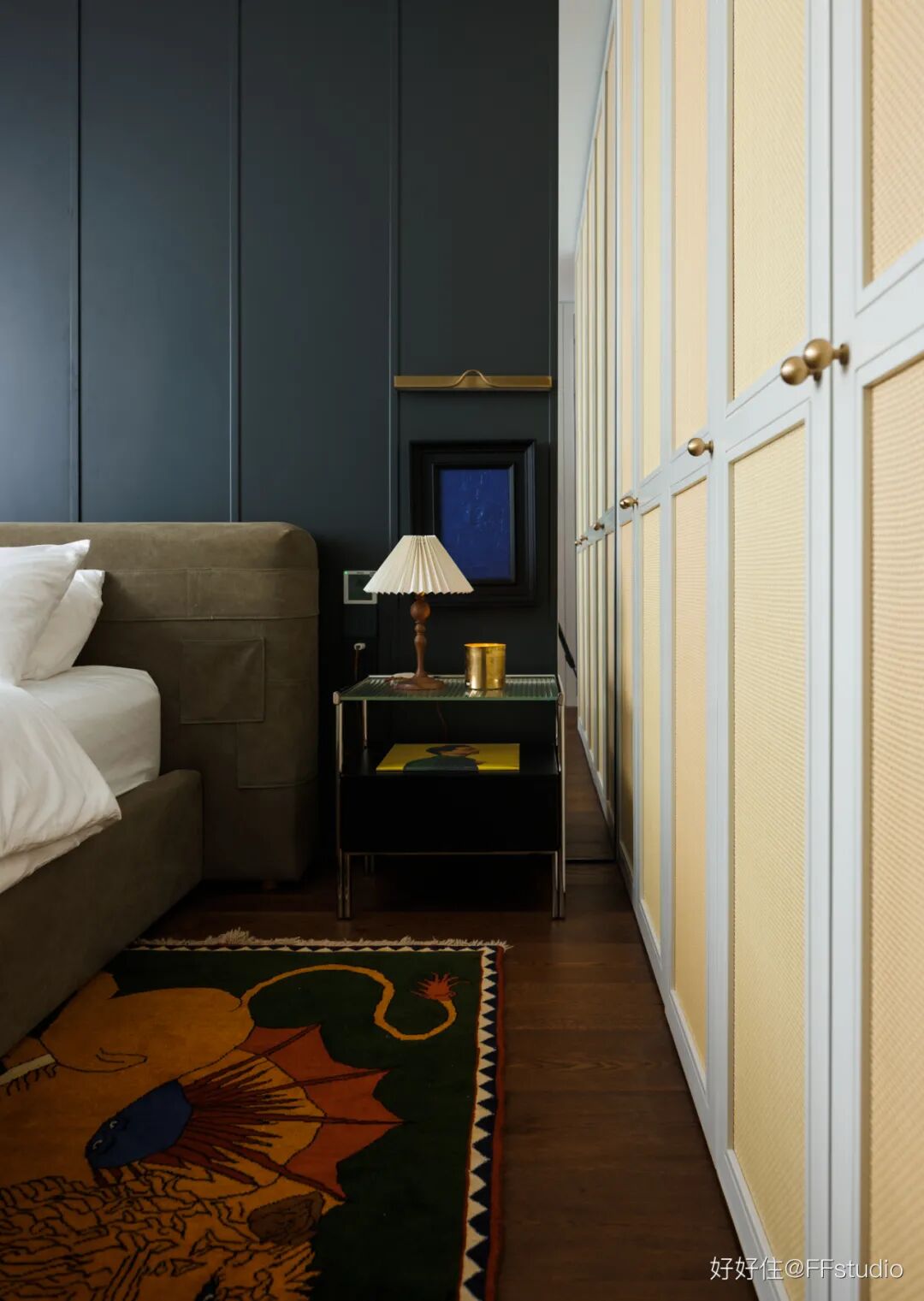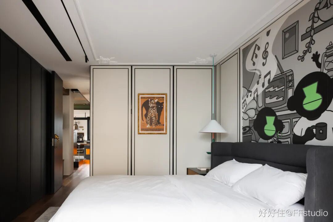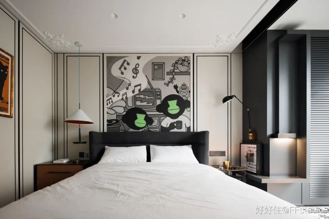 FFstudio:爸妈房间的床,选了1.5m的,他们觉得足够了,这个空间有一个小遗憾,就是给他们设计了专属的插画,一个在喝茶,一个在织毛衣,结果因为床背太高,把插画挡住了。他们的衣柜也是新的尝试,暖白色的柜门加上黑色的线条,整个调性就被拉得很复古。我妈喜欢简单的东西,所以吊顶就是简单的白色乳胶漆和石膏线条,没有着色。床头那个Maison Dada的吊灯,到现在看还是很有质感。