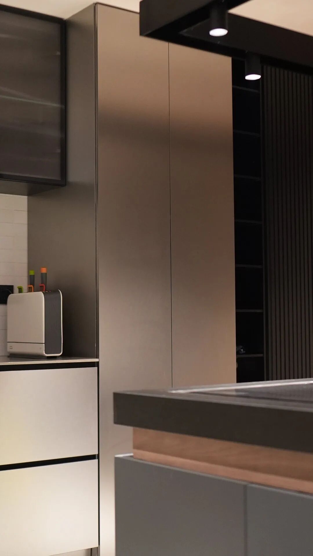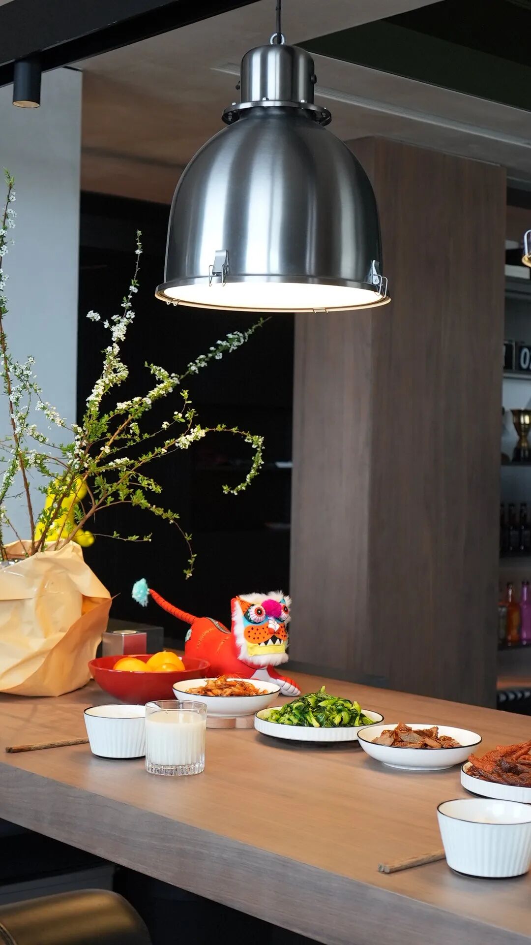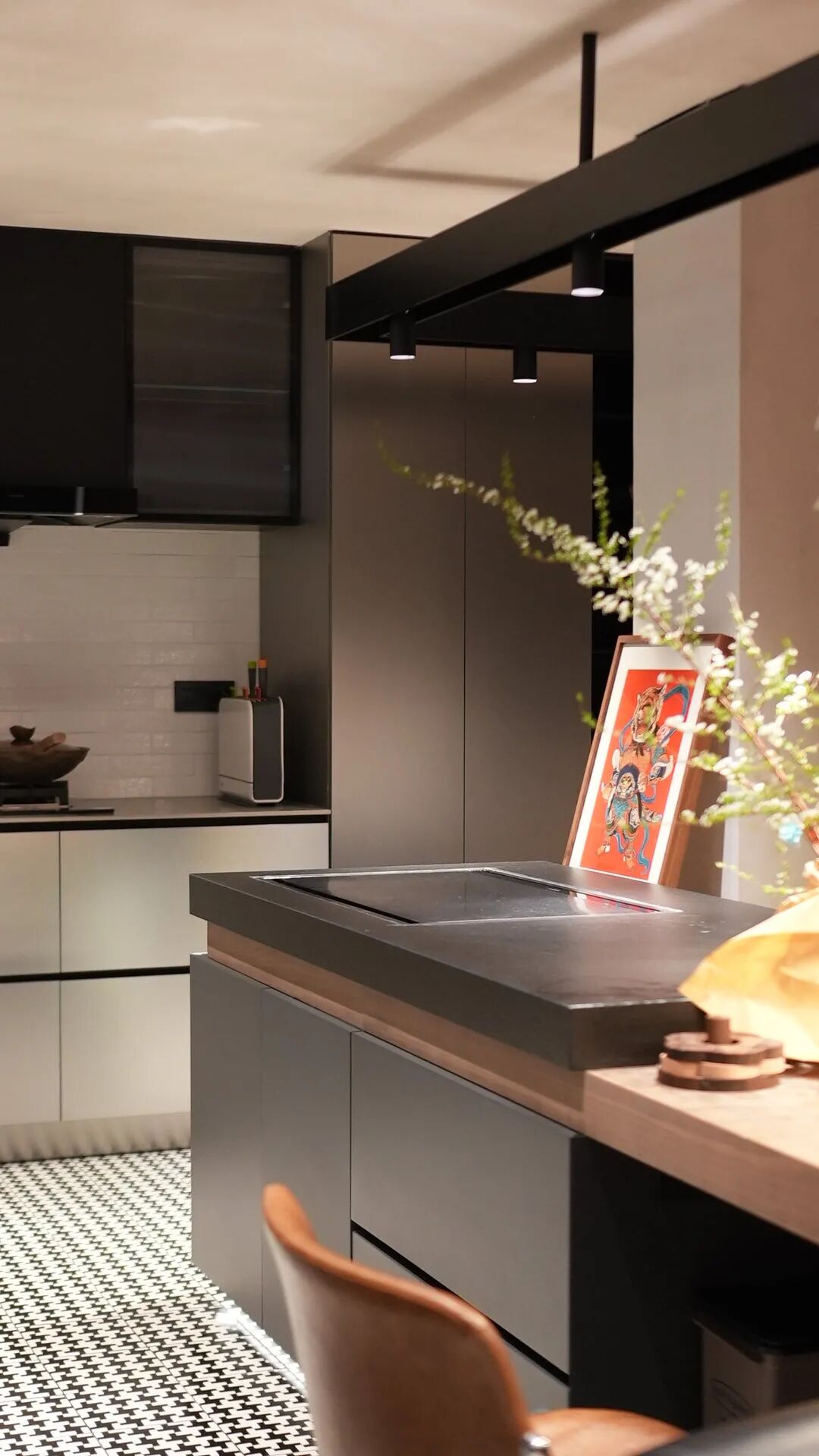 FFstudio:这样改完以后会有一个6米长的操作台面,除了蒸烤箱、洗碗机这种比较标准的厨电,我会提前设置水电位把他们都藏起来之外,我还买了好多好看的厨电和摆件(有些在拍照的时候拿掉了),这样整个空间生活气息会比较浓重,也会很好看。很多业主跟我一样喜欢买杯子,家里来客人的时候给他们倒水,或者自己随心情去换杯子用,也是一件很开心的事情,特别是颜色很跳跃、饱和度很高的杯子,在白色的墙前也显得十分亮眼。上面的金属扣,其实是一盏壁灯。