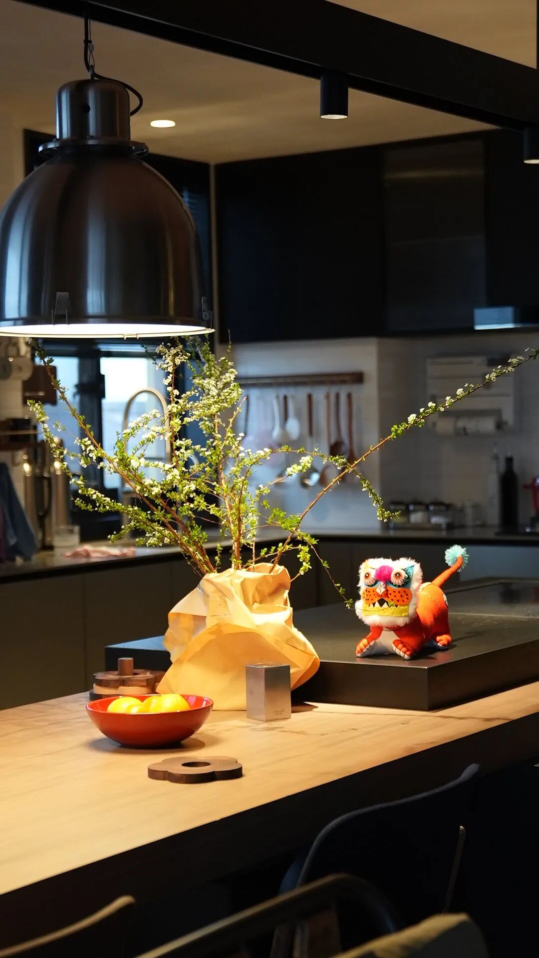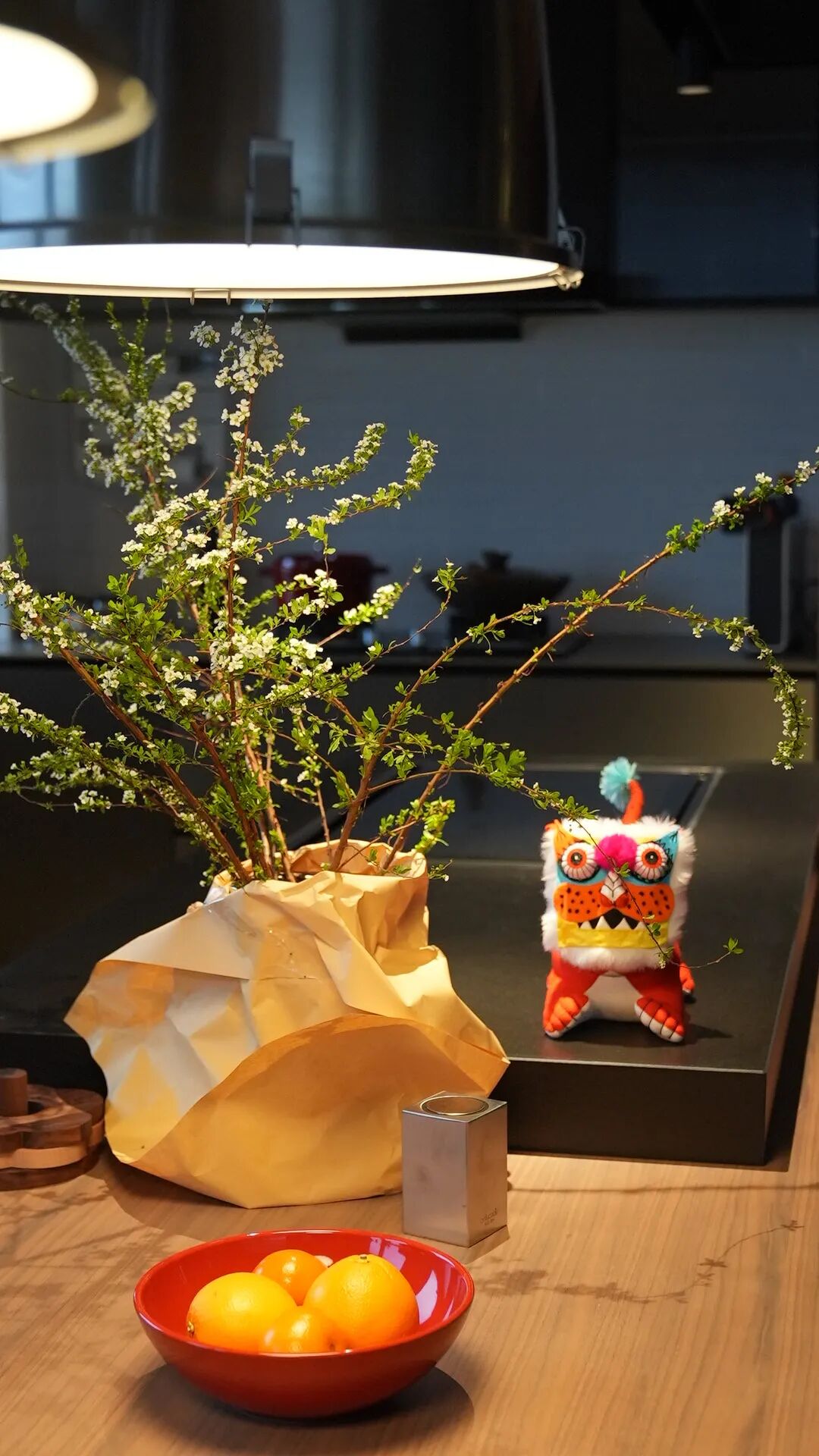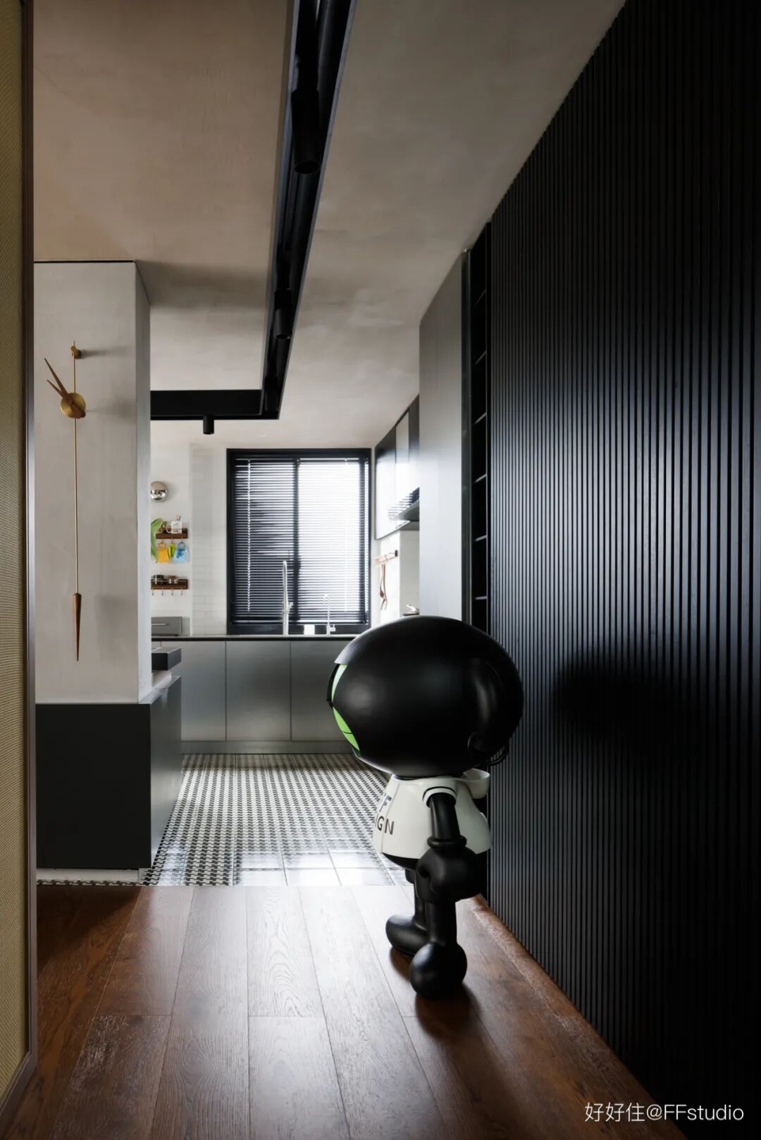 FFstudio:从玄关走道看过去,便是厨房区的窗景。这样的设计,虽然在入户增加了一道隔断,但还是坐拥两个采光点,让玄关明亮起来。和厨房相连的位置,放了一个我们公司的IP——阿鲁卡。因为我本身很喜欢潮玩嘛,所以这个IP也算是满足我的心愿。