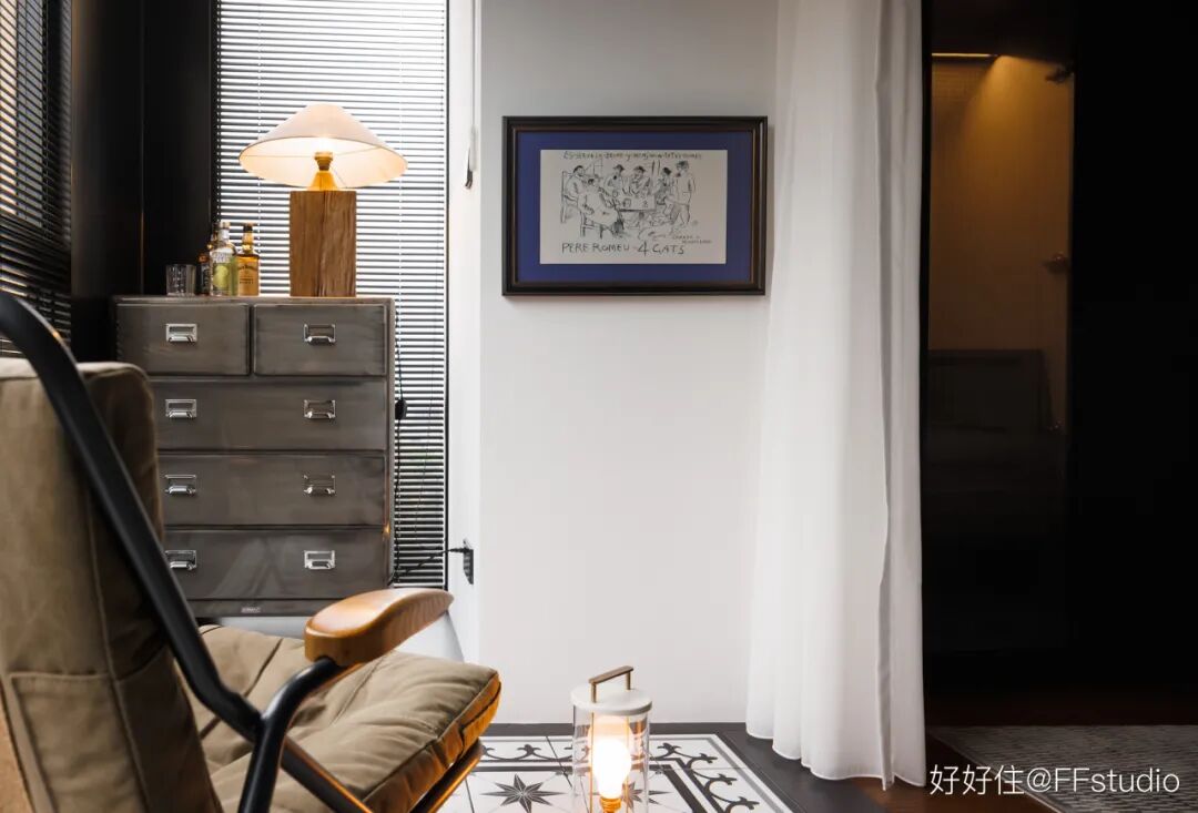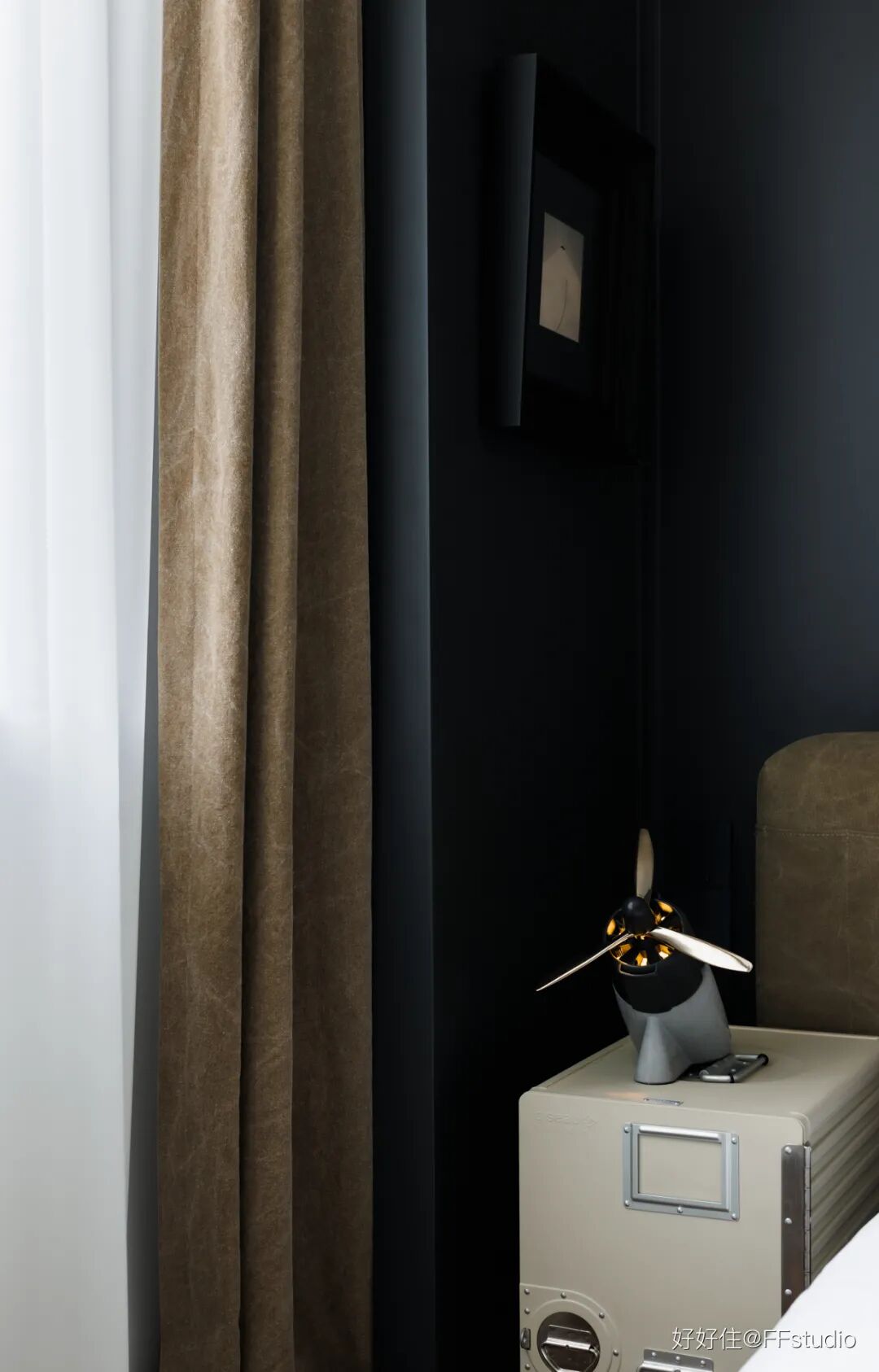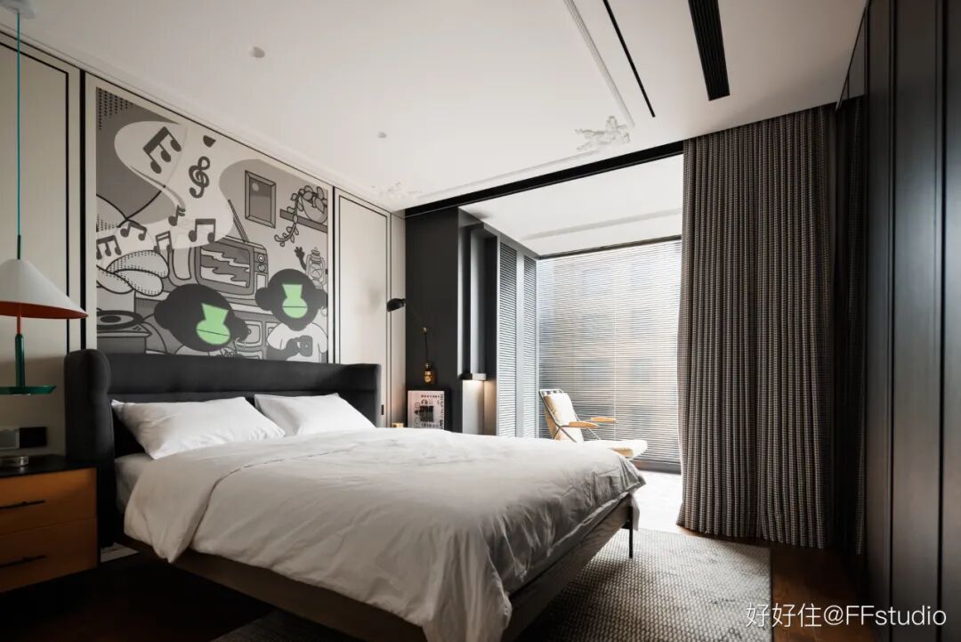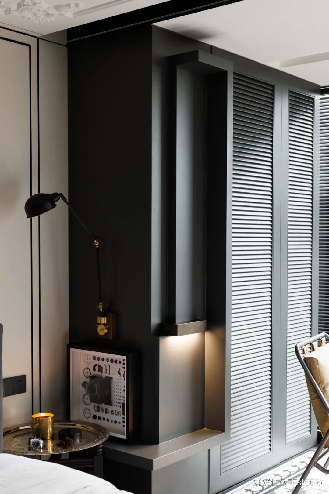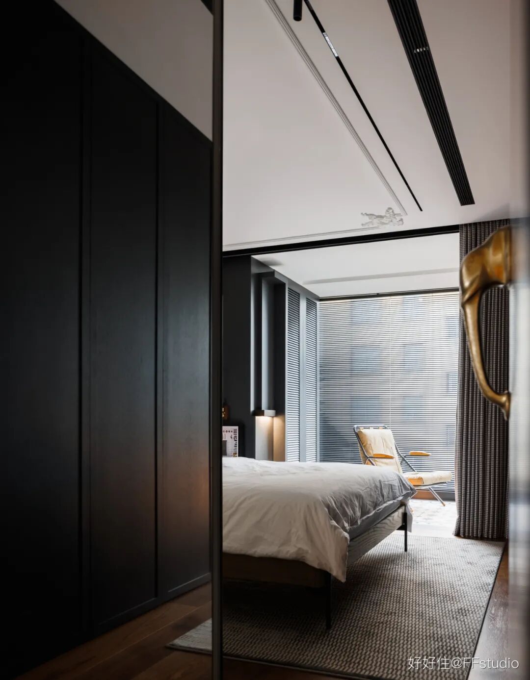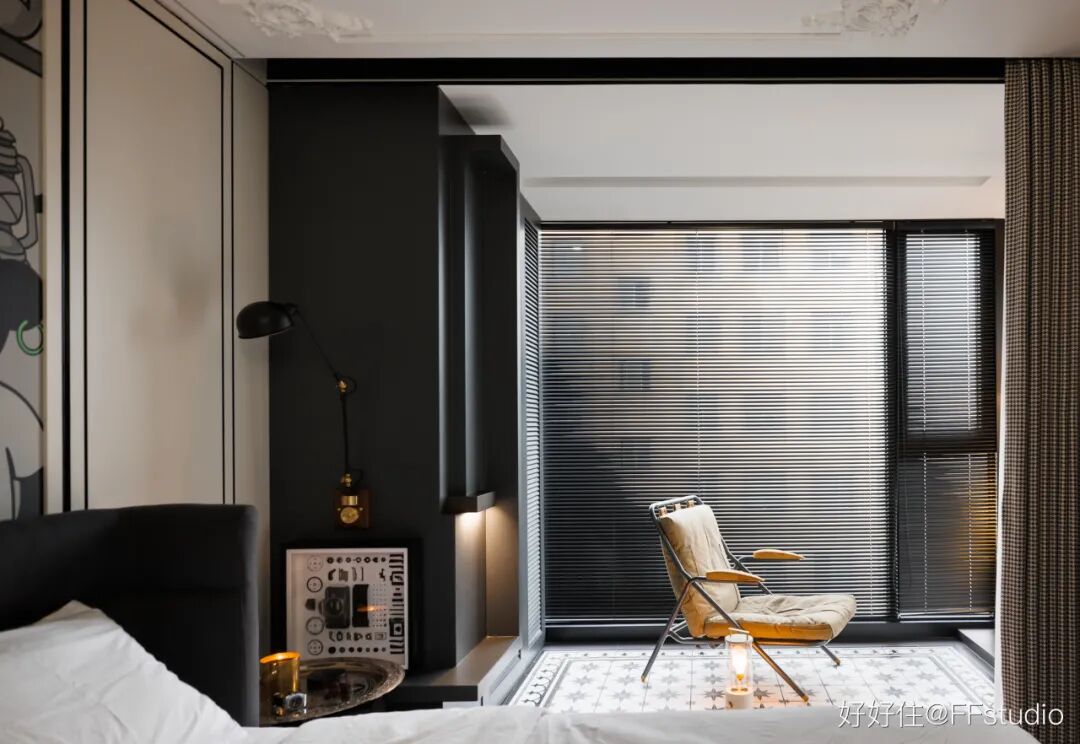 FFstudio:爸妈的房间就是简单的黑白配色,有个小阳台,也是整个打开收进卧室空间了。我在阳台上装了黑色的百叶,整个光影就显得空间很有质感。中间装了个千鸟格纹的遮光帘,方便他们晚上睡觉的时候使用。