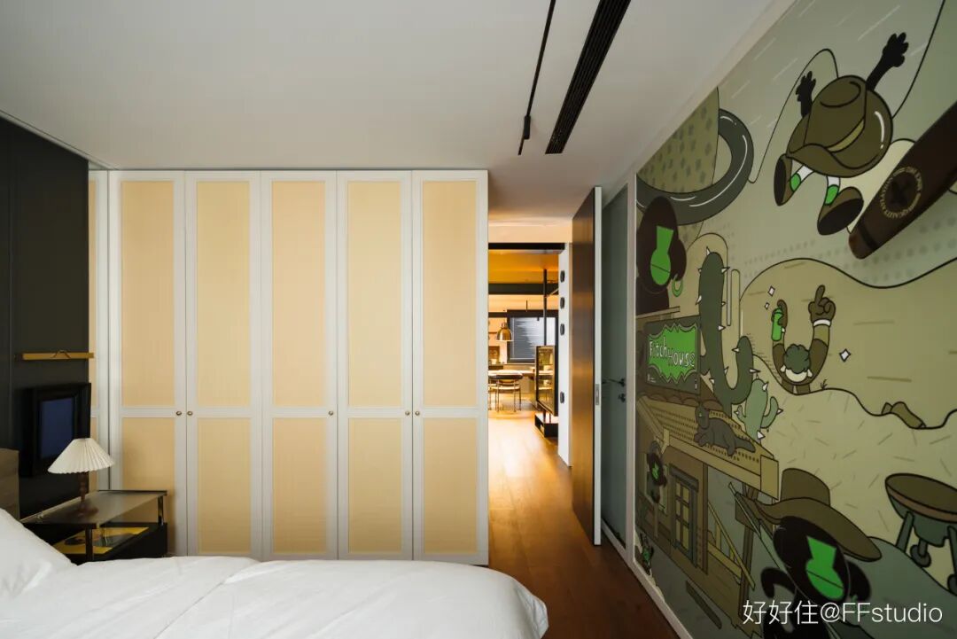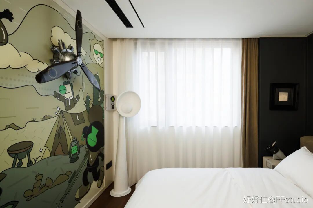 FFstudio:正对床的背景墙,也是以我们FF的IP阿鲁卡为主角做的插画,我本来买了一个飞行器的摆件没地方放,我妈说放这里,试了一下还是蛮好看的。可能我的审美遗传我妈吧。