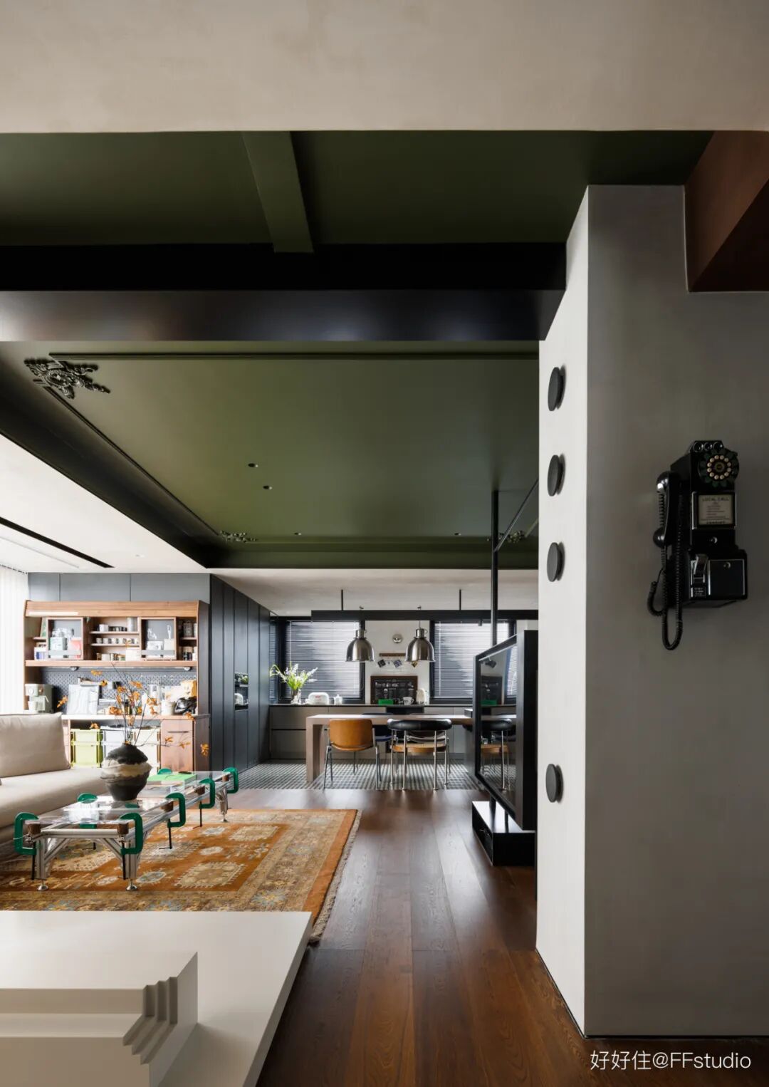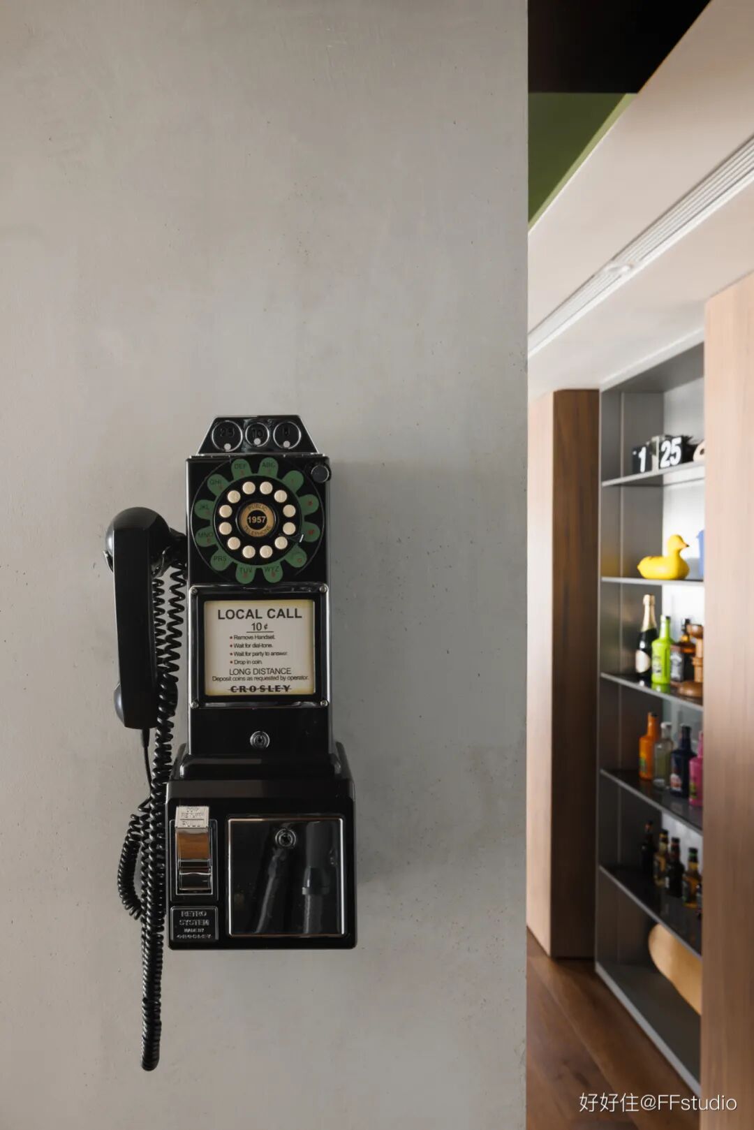 FFstudio:承重柱两个侧面,也挂了一些金属的圆点装置,或者时尚复古的挂号电话,让惊喜存在于每一个细节之中。