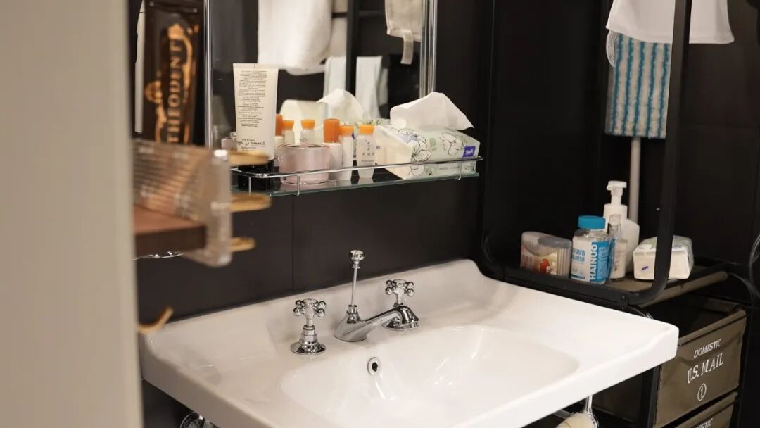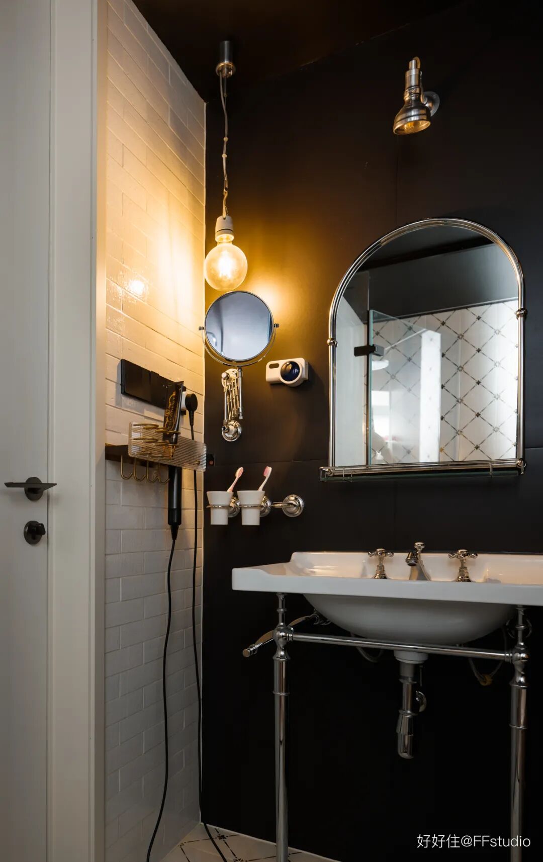 FFstudio:原本这个房子是两个卫生间,只保留了这个。因为平时就我爸妈在,他们使用的话一个也就够了。洗手台放了一个开放式的,简约又很复古,基本上没什么多余的结构,是不是很像80-90年代医院或者美式餐厅卫生间的盥洗区。在淋浴区也用了一面墙的黑白花砖,但这个花纹要比餐厅地面的花砖更加秀气,这样看起来保证空间复古感十足的情况下,也很清爽。