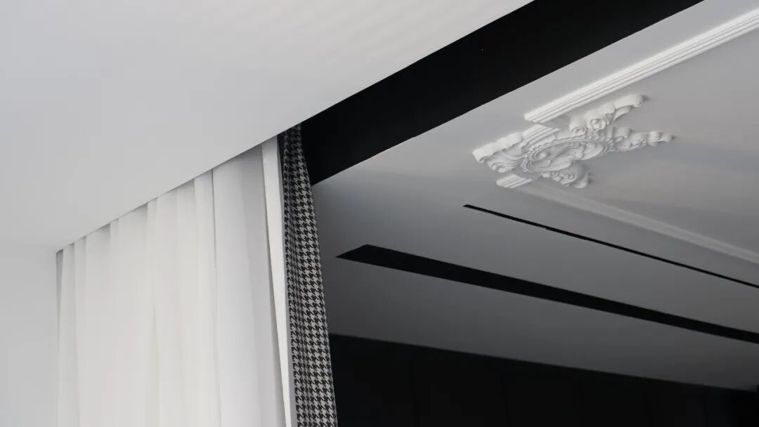 FFstudio:客厅吊顶这边,有两个金属的体块,也是卫生间拆掉以后,有管道位置,用来把管道位置包裹进去,这样也会比较好看。