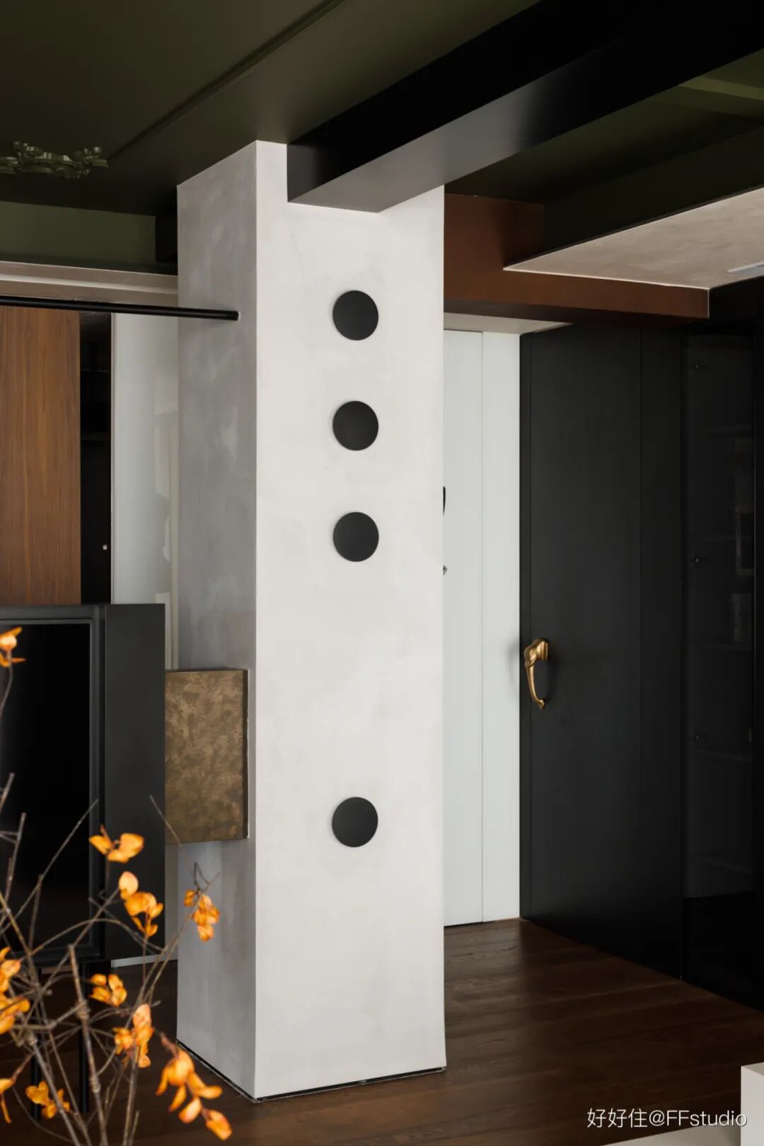 FFstudio:Nomon的潘多拉挂钟,跟这个承重柱很配。非常简洁不引人注目,但是黄铜质地和艺术漆的结合也让空间变得很精致。有时候空间的软装做的好不好,就是通过这些不经意间,看似无用的物品来呈现。