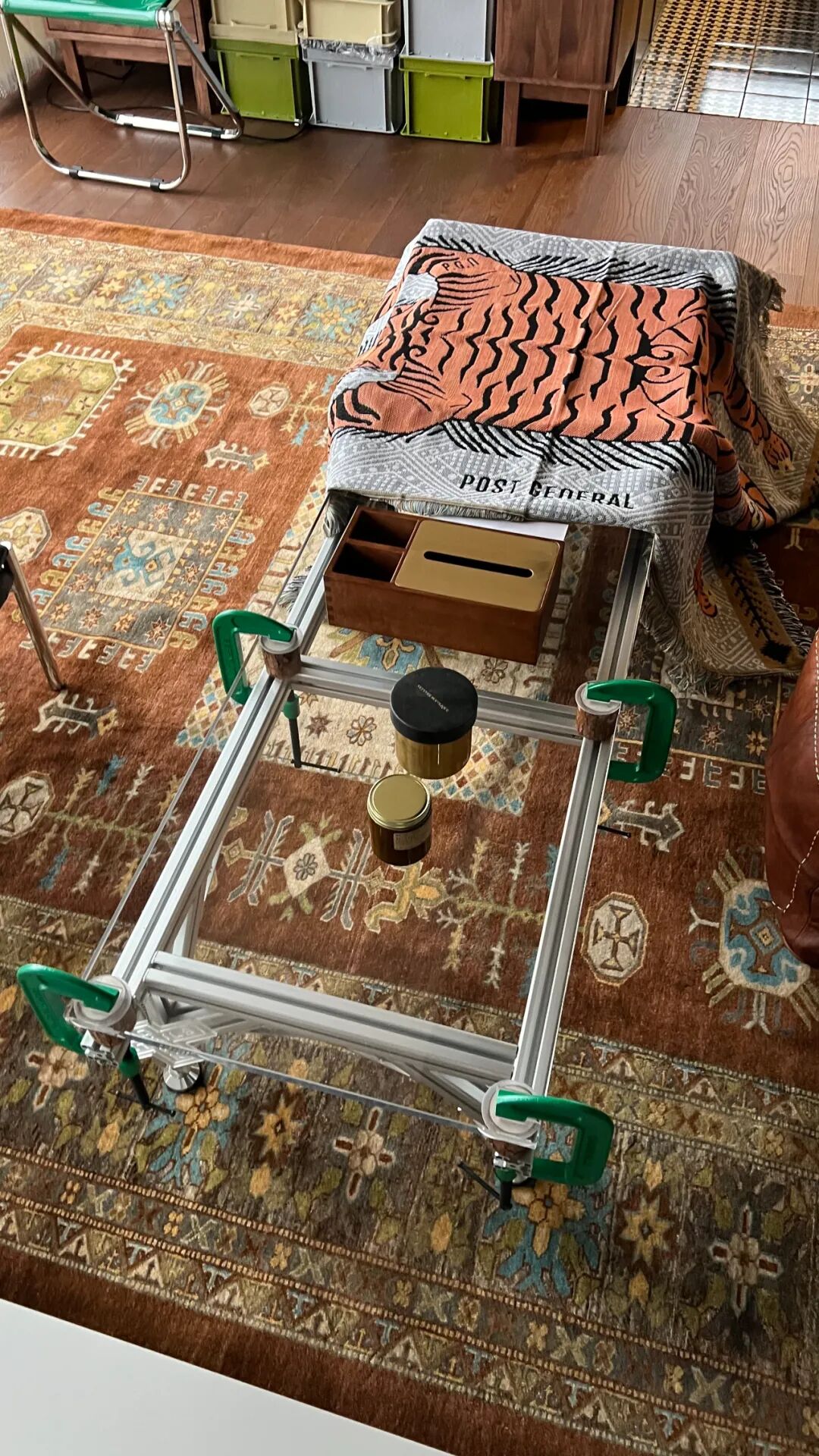 FFstudio:茶几是当时wallpaper临时展买的,特别喜欢那个绿色的框架,为了呼应这个茶几的设计,我还在上面放了本Nike绿封装帧的书。好看归好看,还是躲不过我妈的吐槽,说走来走去有时候会碰到。
