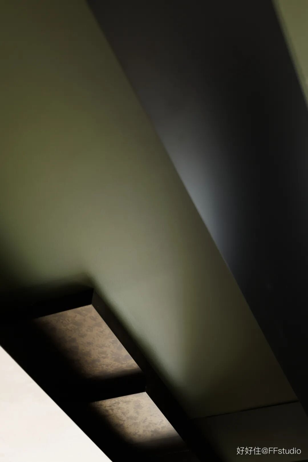 FFstudio:沙发旁边这根承重柱,就是其中一个卫生间拆除后留下的,这里和客厅衔接的位置做了一个地台,让空间呈现出层次感。地台下方设计了一圈灯带,让整个结构呈现呈悬浮状,在这样一个暗色调的空间中,就会显得很轻盈。而角落里加入的阶梯状细节,则是对卡洛·斯卡帕的致敬。