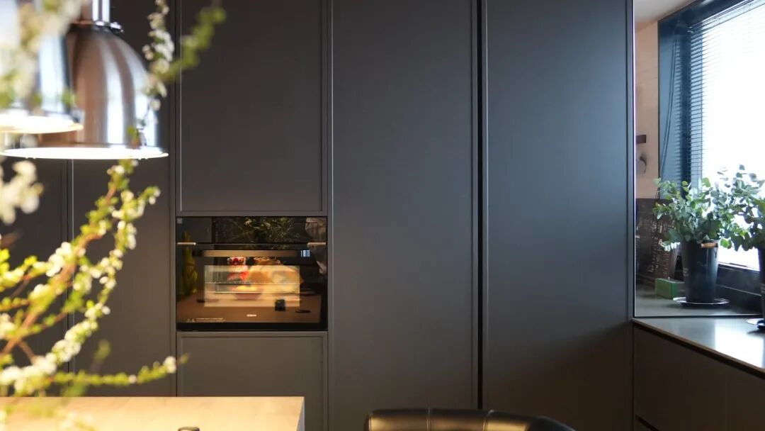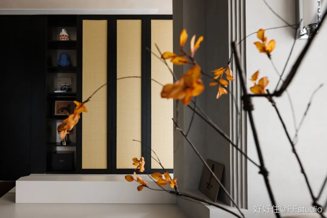 FFstudio:可能是写意空间的沙发太舒服了,平时我妈霸占沙发的时候,我爸会在地台上放一个15公分的软垫,就又是一个独立的躺平区。藤编柜门和全黑的全屋定制柜面一起,形成一个绝美的拍摄角,在墙面的边缘,其实还藏了一个投影幕布,晚上的时候,可以坐在餐厅那边看电影,也很美。