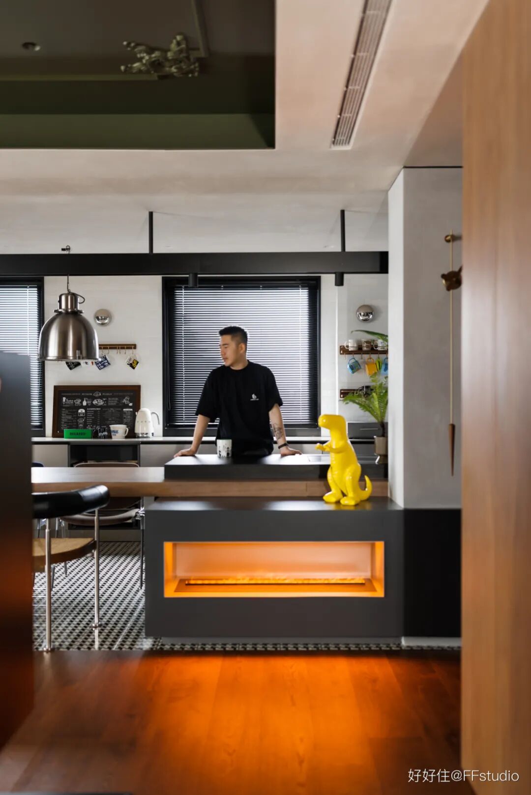 FFstudio:原先的厨房打开,就留下了一根改不掉的承重柱,从玄关走进来就能看见。干脆利用这根承重柱,做了一个视觉上具有穿透关系的结构体,交织出壁炉+中岛+餐桌的形式,不仅让柱体自然成为空间的转折,也让原本作为家庭的刚需的【餐桌+中岛】变得更有层次起来。图3是壁炉打开的时候,让空间洋溢出一丝暖意,哪怕是夏天,也可以单开加湿功能,会有一丝白色的烟雾,就像是柴火燃烧的景象。