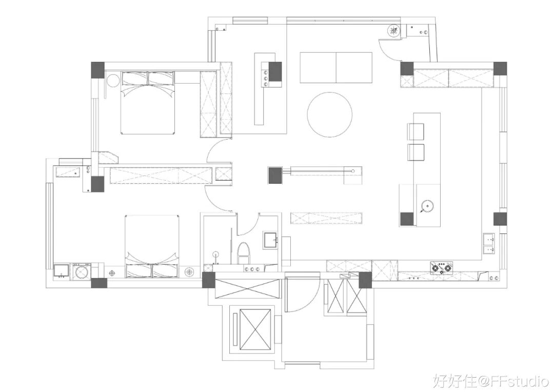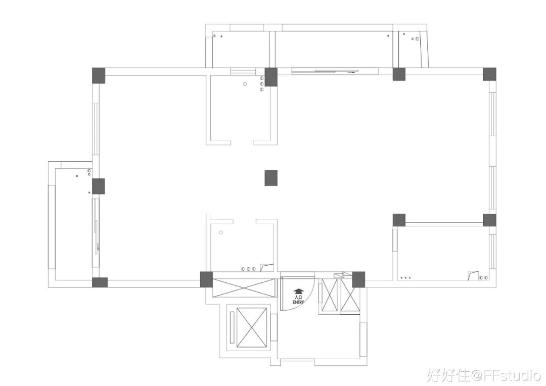 FFstudio:原始平面。这套房子建筑面积有128㎡,虽然有一些公摊,但是两边的阳台面积又是赠送的,总得算下来有120㎡多一点,阳台的视野很好,能看到老城区和新城区的景观。这套房子的原始户型是四室两卫,但平时只有我父母两个人住,我也是逢年过节偶尔才会回家来住几天。当时选中这套房子是因为我看了结构图,在整个空间中只有3根承重柱是不能动的,几乎没有不能拆的承重墙/结构墙,其他空间都可以打开,毕竟是我们自己的家嘛,所以还是想按照自己的想法来,就选择了这样一个自由度比较大的空间。当然缺点也还是有的:1、入户没有玄关;2、原先的厨房空间比较小而且封闭;3、4室2卫的格局其实没啥用。