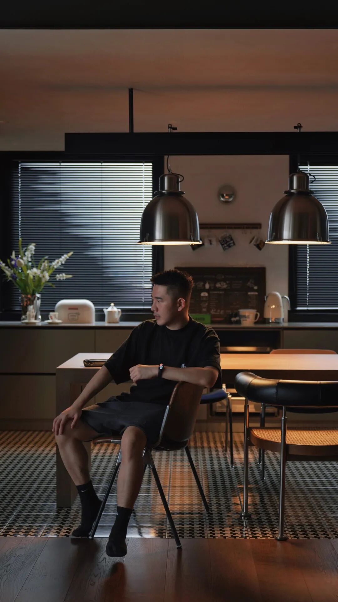 FFstudio:沙发所在的位置,其实是原先客厅和阳台的分界线,我将阳台收进来,直接做进公区,把空间中采光最棒的位置给到客厅。沙发不靠墙,在落地窗前留白出一个走道的位置,可以通往一个小型的收纳空间,也让阳光和空气自然流淌。更多的时候,我会选择把百叶帘关上,很多时间我们回家窝在沙发里,是希望周围的空间有光,但又不要那么亮,所以这样处理我会觉得居住感真的很不错。傍晚太阳下山的时候,就可以把窗帘打开,看看对面学校篮球场上挥舞的青春。