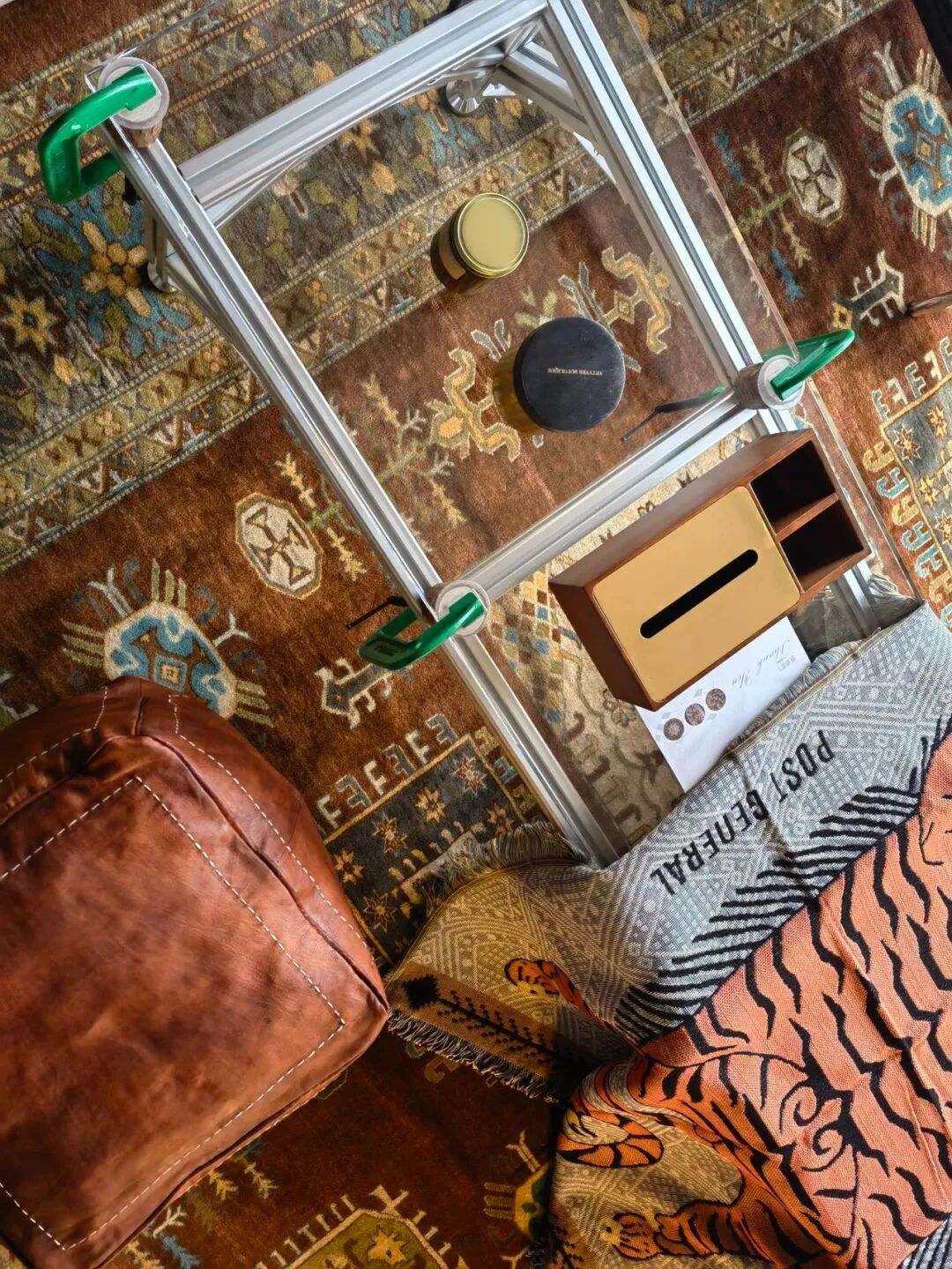 FFstudio:客厅的地毯是当时家里淘得最贵的一件单品。进口的手工部落地毯,独一无二,当时一眼就看上了。