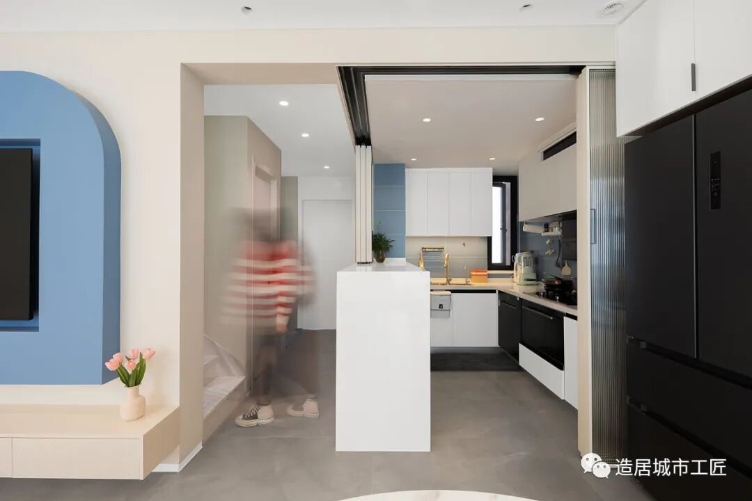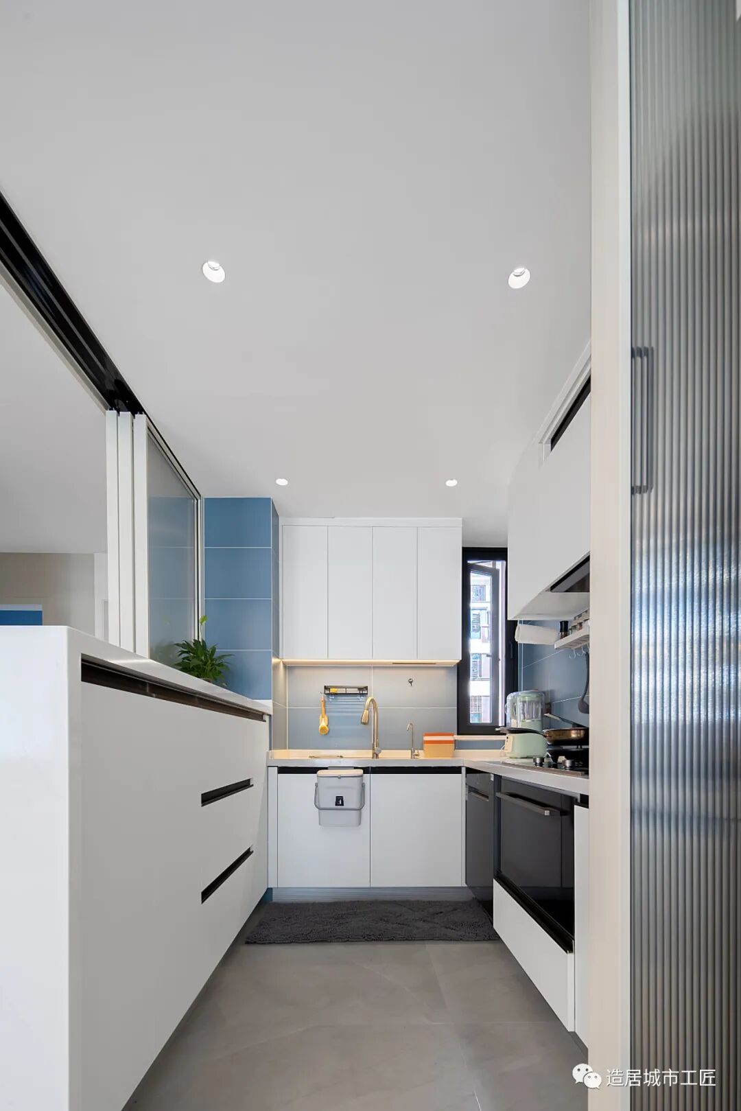 U型橱柜布局,构建出一条流畅的洗切炒动线,蓝白相间的柜体与客厅配色形成呼应,确保整个无界限区域的风格统一。
