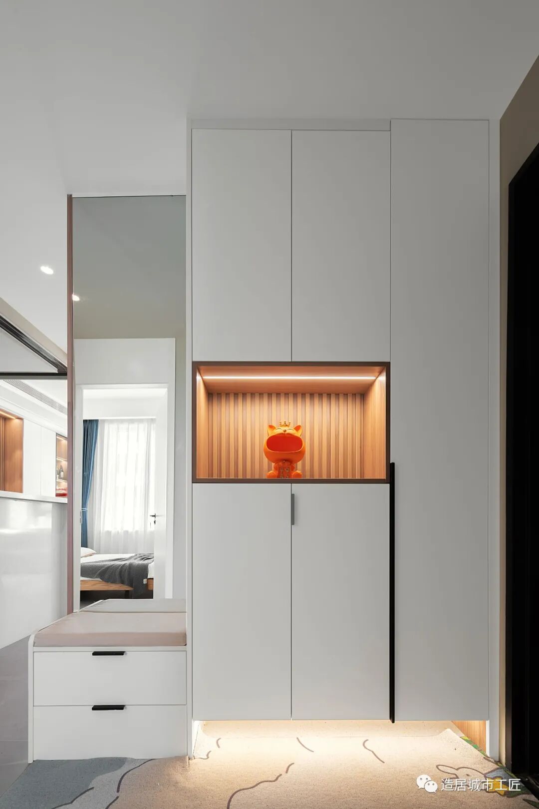 入户从地面开始,就极有特色。它并没有选择不同材质来形成视觉上的区隔,而是别出心裁的用了一块趣味地毯做分割,在底部隐入光影的映衬下,氛围感被拉到极致。右侧墙面做了收纳型玄关柜,以鞋柜+试衣镜+换鞋凳组合而成,素白配色显得规整利落,在完成功能性升级之后又多了一些设计美感。