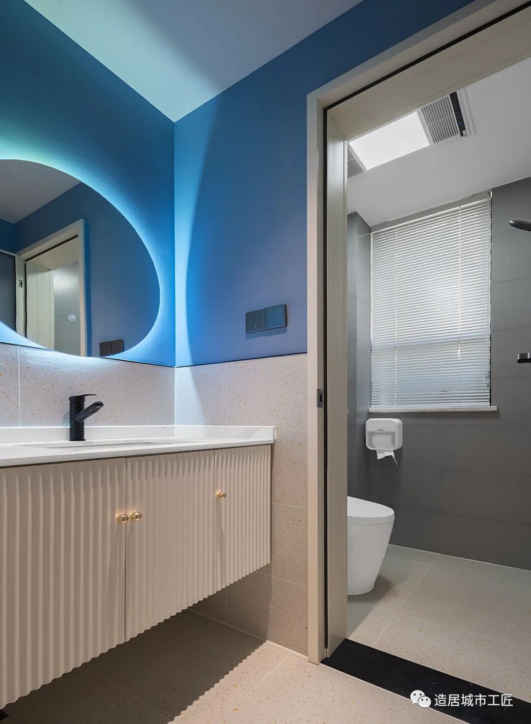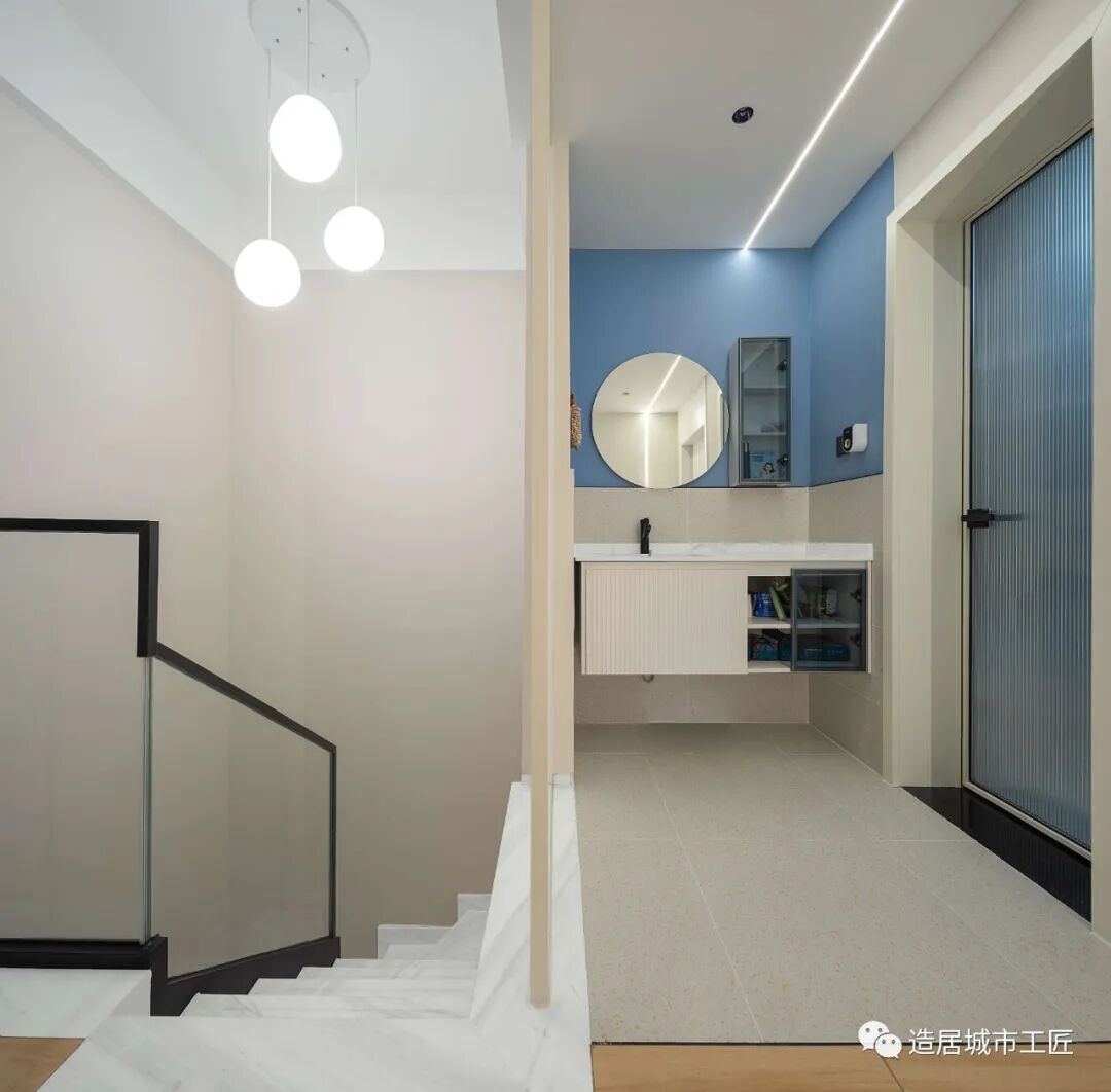 一楼公卫内退卫生间门,让入户门与其之间有了缓冲空间,洗手盆外移,实现洗漱区、如厕区和淋浴区三分离。蓝色半墙与水磨石的拼接,在保持干净整洁的同时也增加了色彩之美。