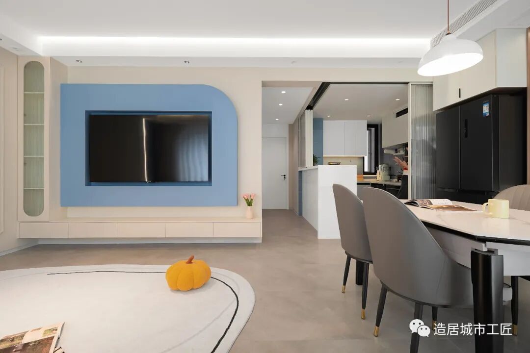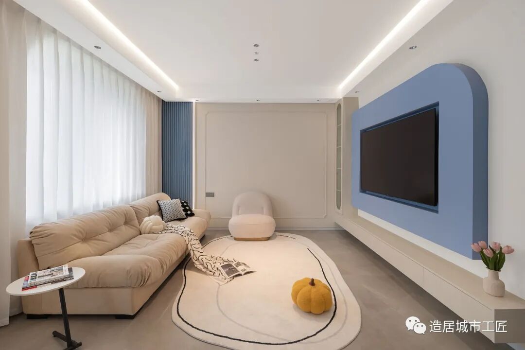 电视主墙取几何符号做元素,描绘出边柜与电视柜,注入的蓝色与杏子灰,恰与沙发、窗帘、地毯等呼应,组合成一组温润纯粹的色调,在阳光的映衬下泛着不可言表的浪漫与治愈感。