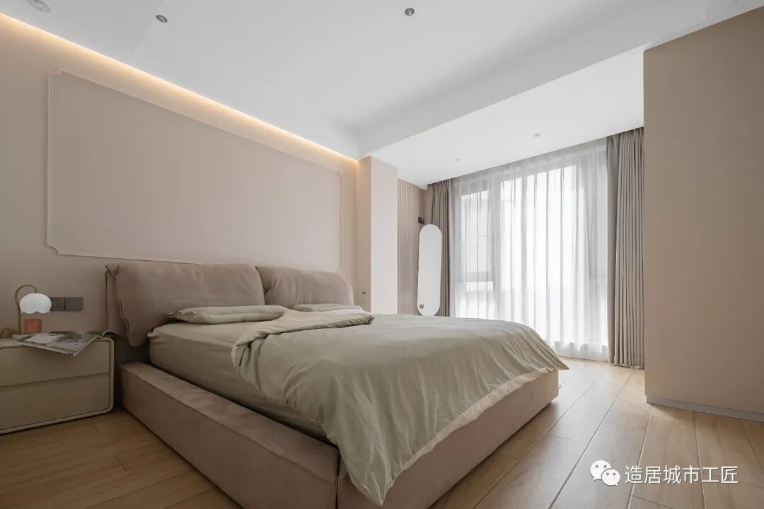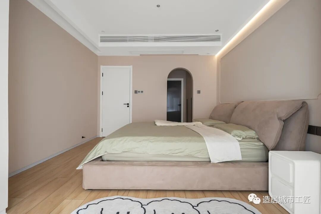 配色以柔和为主题展开,奶咖色大面积上墙,辅以大地色系家居做点缀,温柔舒适。法式线条点缀背景墙处,与通往衣帽间的弧形门洞做呼应,从而营造出一种别致的线条美感。