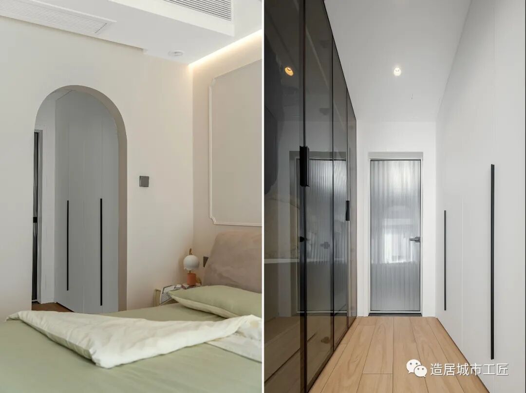 利用新砌墙面将卫生间和卧室的部分空间进行切割,使得卧室内多出一个衣帽间,满足女屋主想要独立衣帽间的需求。