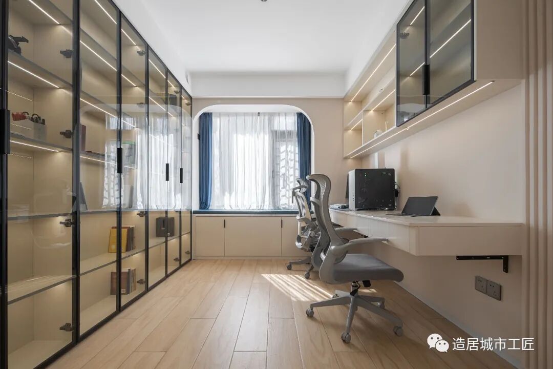 书房对于屋主夫妻来说是很重要的空间,为了保证两人共同办公的需求,做了一整张长书桌,同时还做了一整面的书柜,功能性满分。