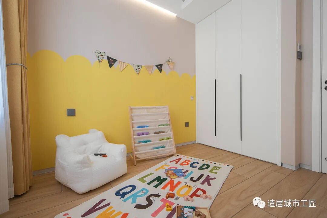 拼色墙面,波浪造型,趣味横生且简单纯粹,中性的黄色色系没有性别之差,也为日后屋主对于小朋友寝具选择留出弹性空间。