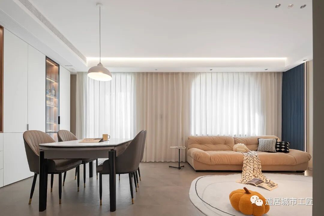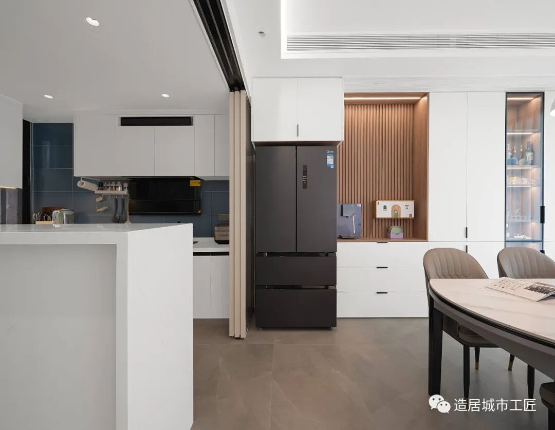 厨房之外即为用餐区域,沿着墙面做了一体式餐边柜,冰箱容身于此,让日常拿取物品方便不少。侧边中部留空,暗藏灯带,承担放置饮水机和茶具的功能,其余封闭的柜体,则用于日常收纳摆放各种物品。