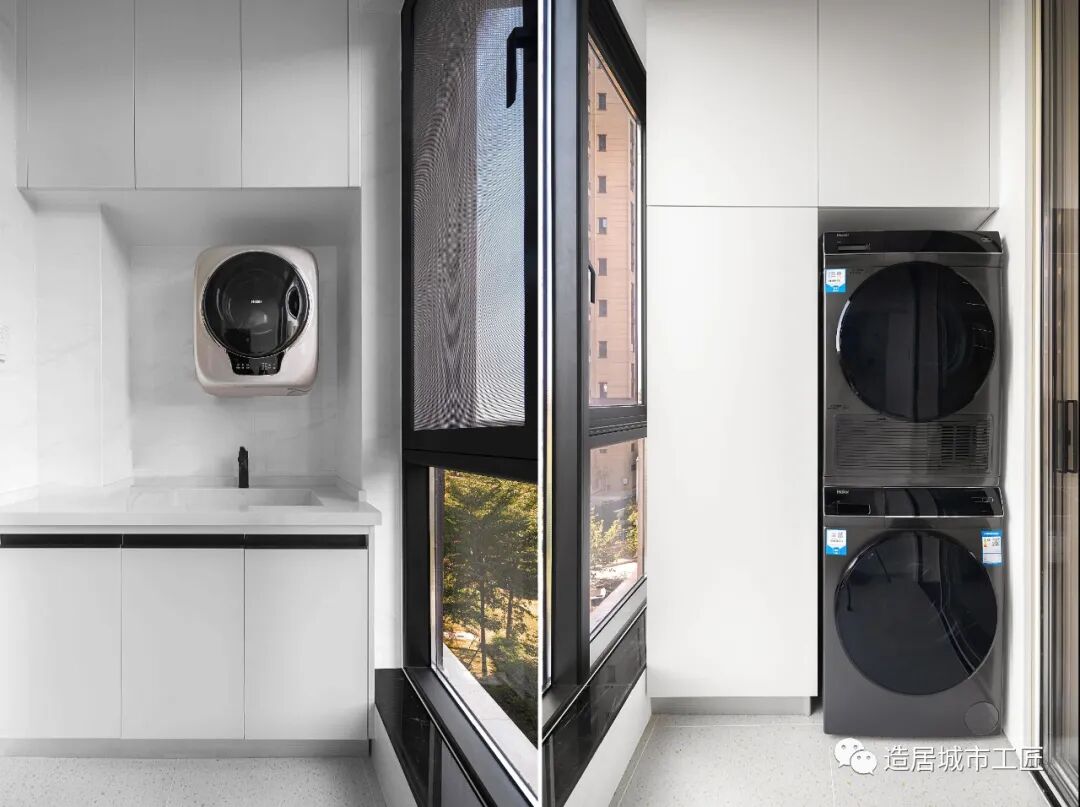 左侧洗衣池+壁挂洗衣机,右侧洗烘套装+家政柜,顶部电动晾衣架,一个完整的功能性阳台就完成了。