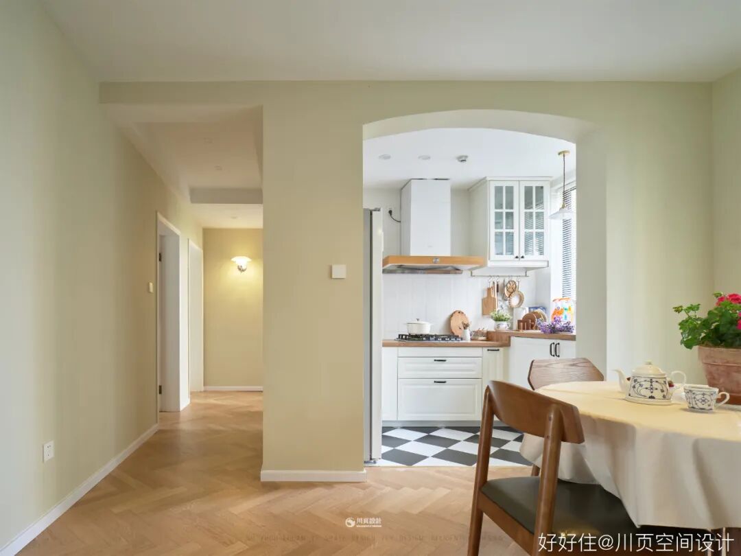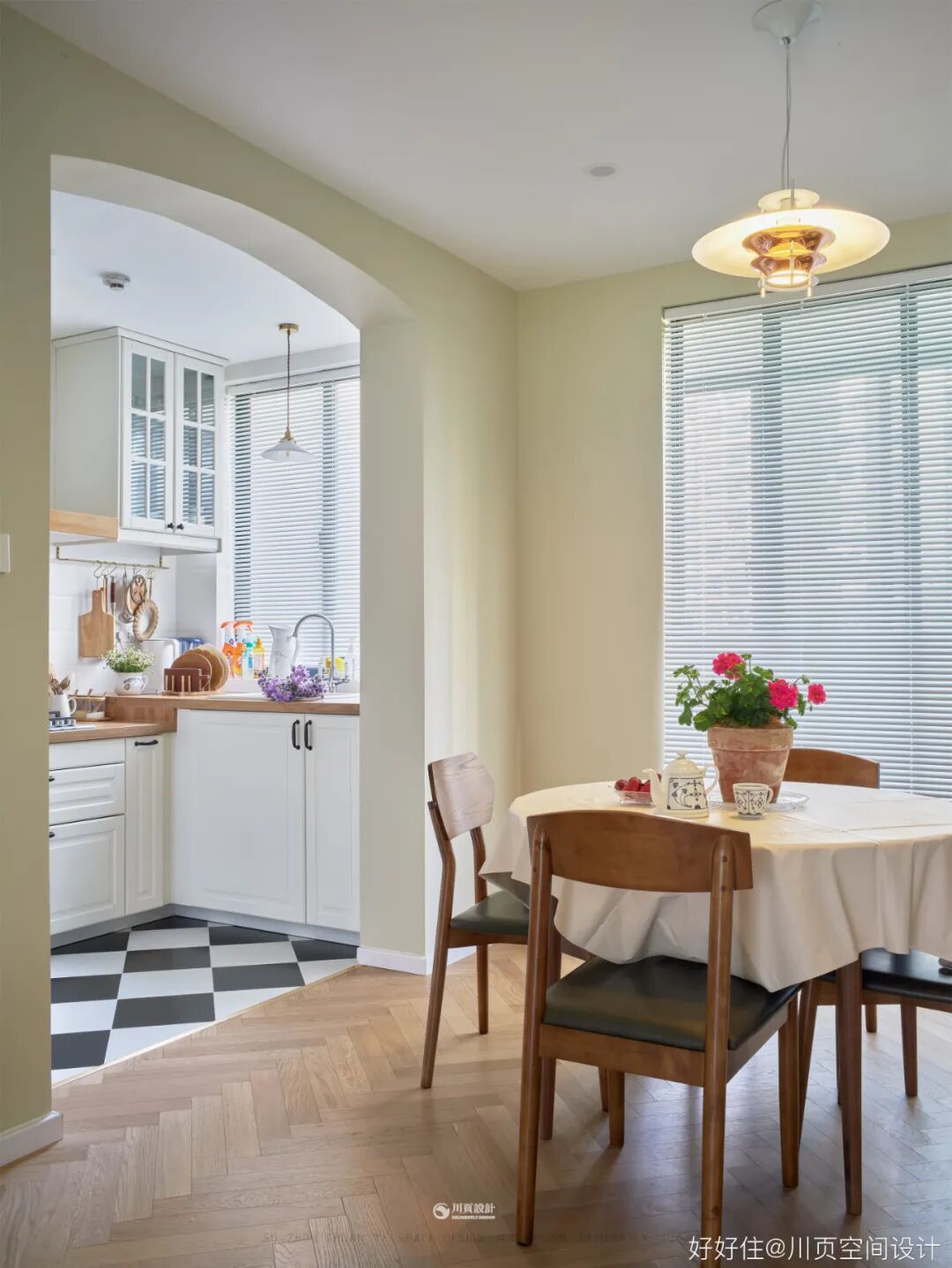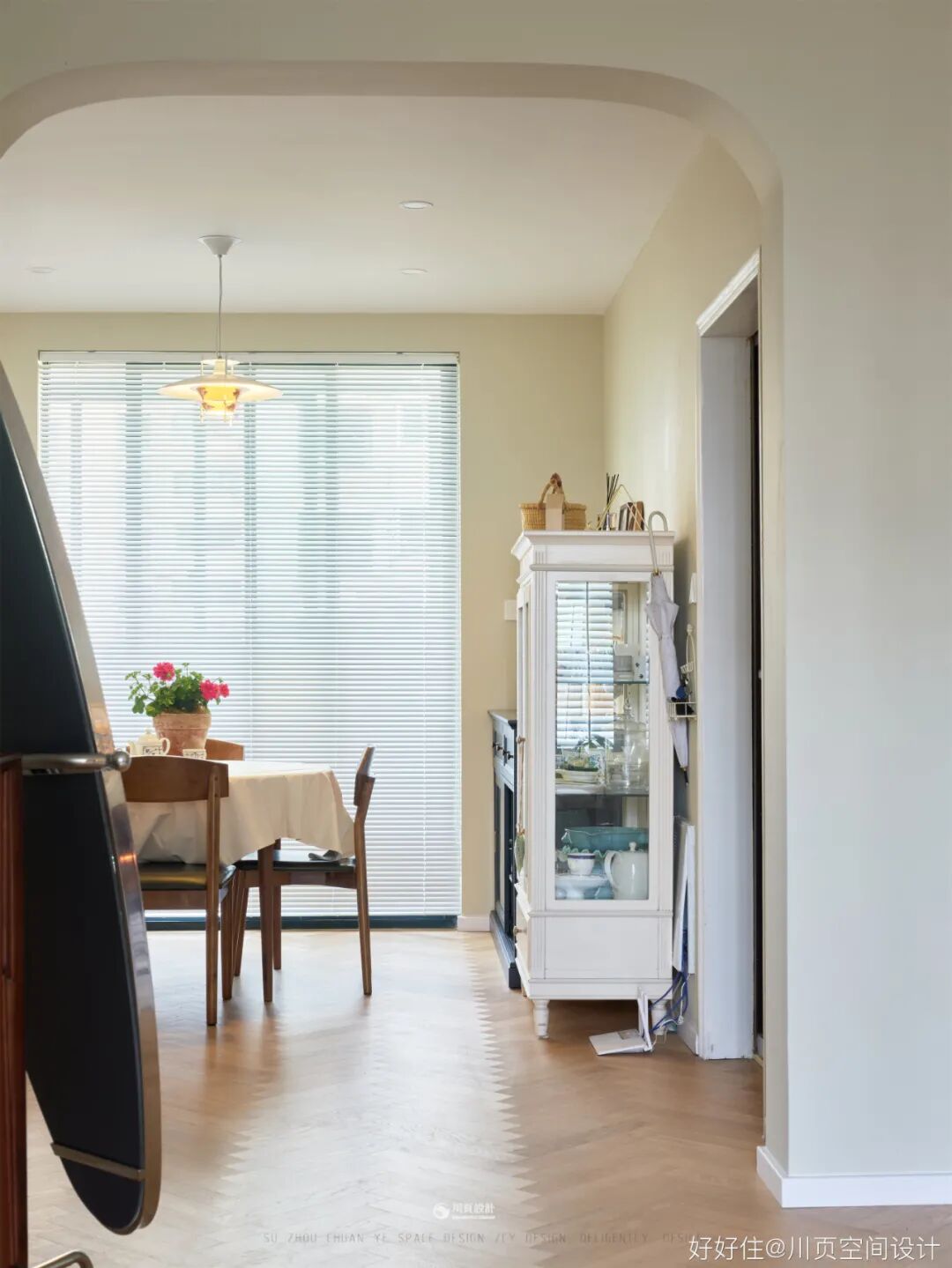 川页空间设计:餐厅和客厅相连,人字铺的木地板加上拱形门设计也是这个家的特别之处,可以明显感受到温暖复古的氛围。