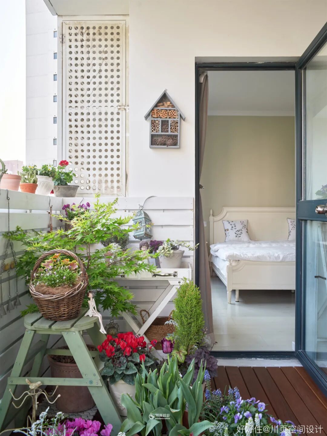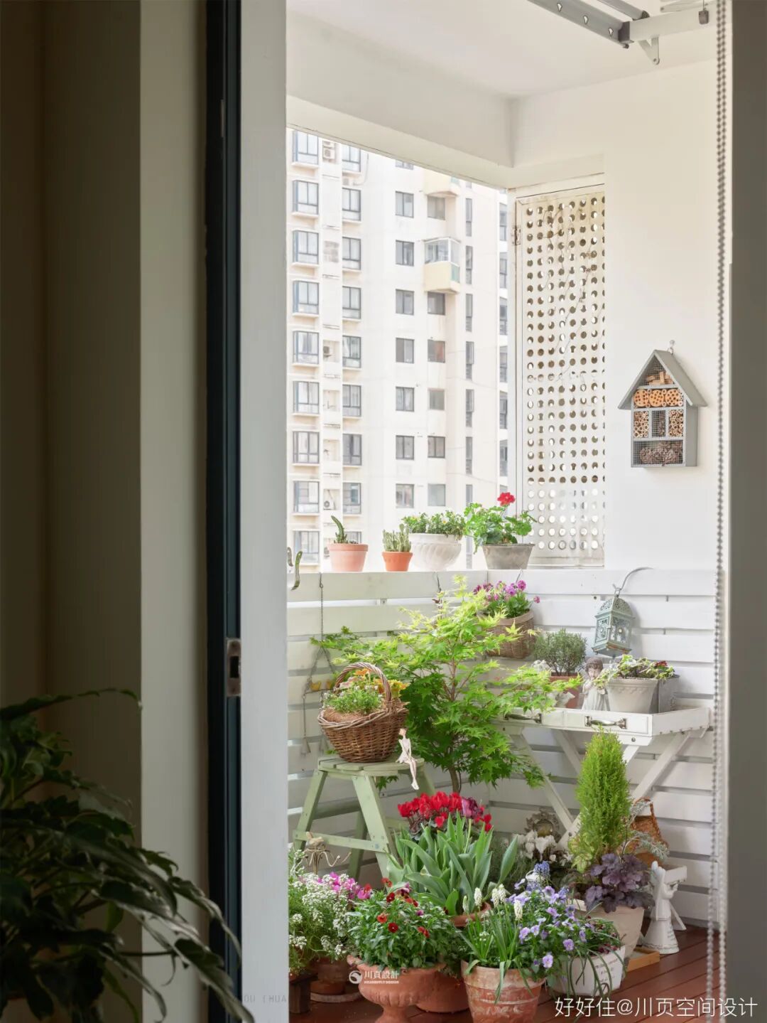 阳台的空间比较大,将近10个平方,深度达到3米,而且女主热衷摆放各种花草,因此结合了屋主的喜好和阳台的实际情况,阳台未封,铺上防腐木地板。天晴的时候屋主可以把衣服晾晒在阳台上,也可以晾晒在阳台外的支架上,下雨的时候把衣服挂到阳台内侧即可。阳台摆满了各式各样的花草,成了一道美丽的美景,也是女主下午茶的绝佳场所。