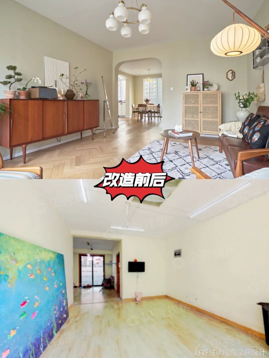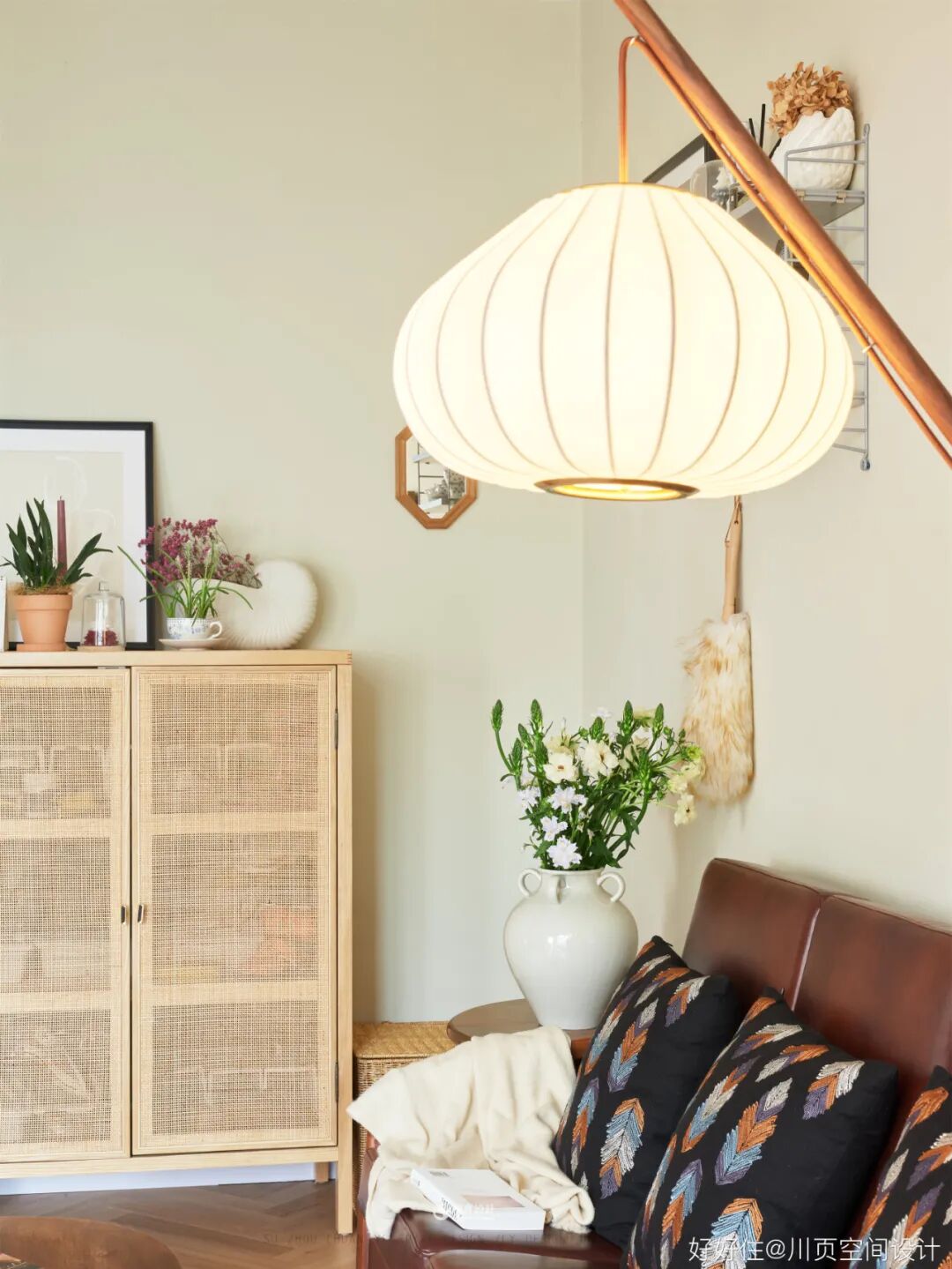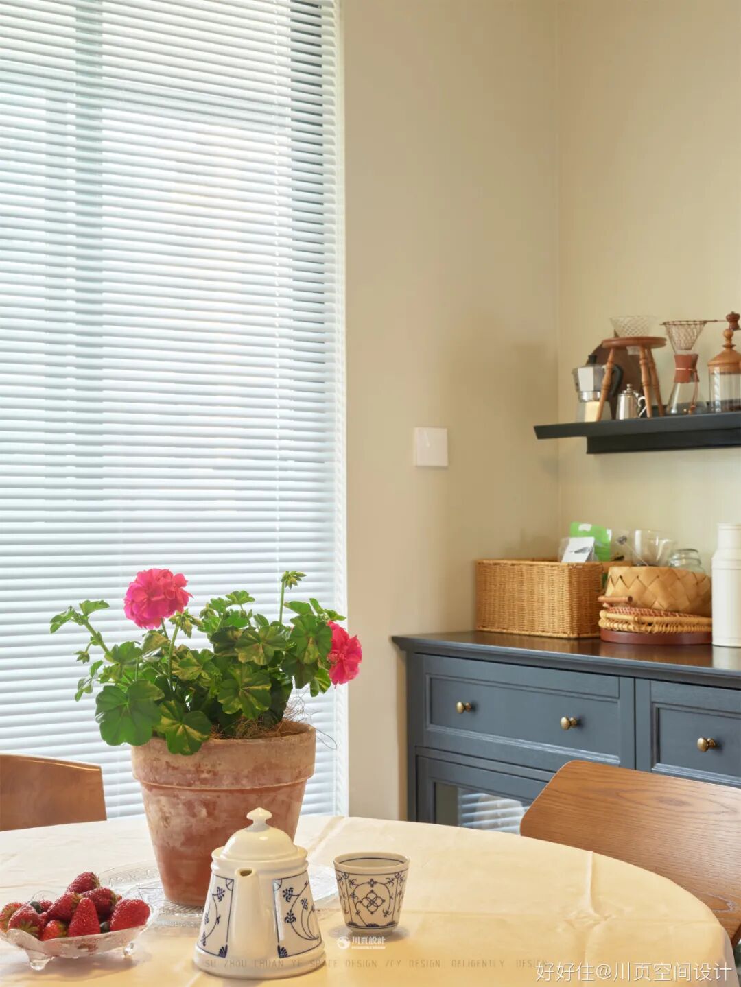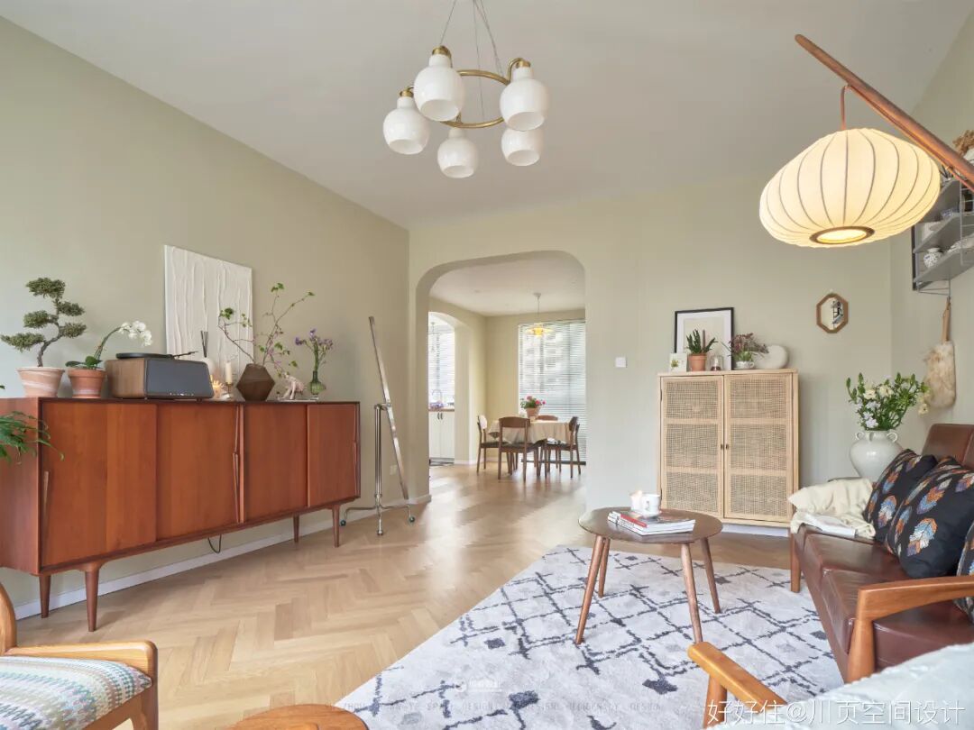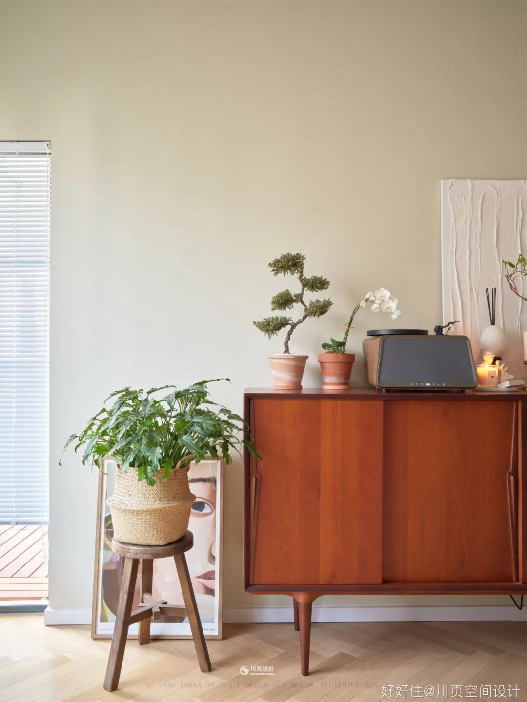这套127㎡的房子位于江苏苏州,业主是一个幸福的三口之家,想要打造出浪漫舒适、小资格调的家。设计师用一排樱桃木收纳柜取代电视墙,解决了收纳不足的问题,沙发旁摆上一盏充满艺术气息的落地灯,在窗边放上轻盈的单人沙发、茶几,还有白色的百叶窗,加之各种绿植和摆件的点缀,复古感满满。