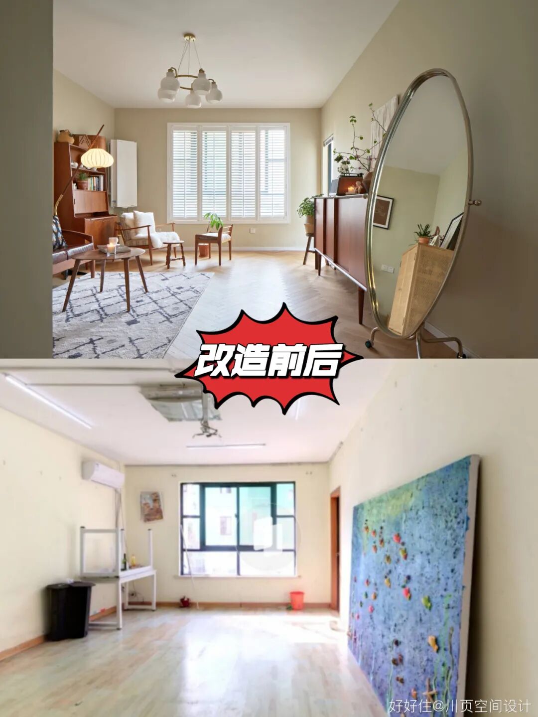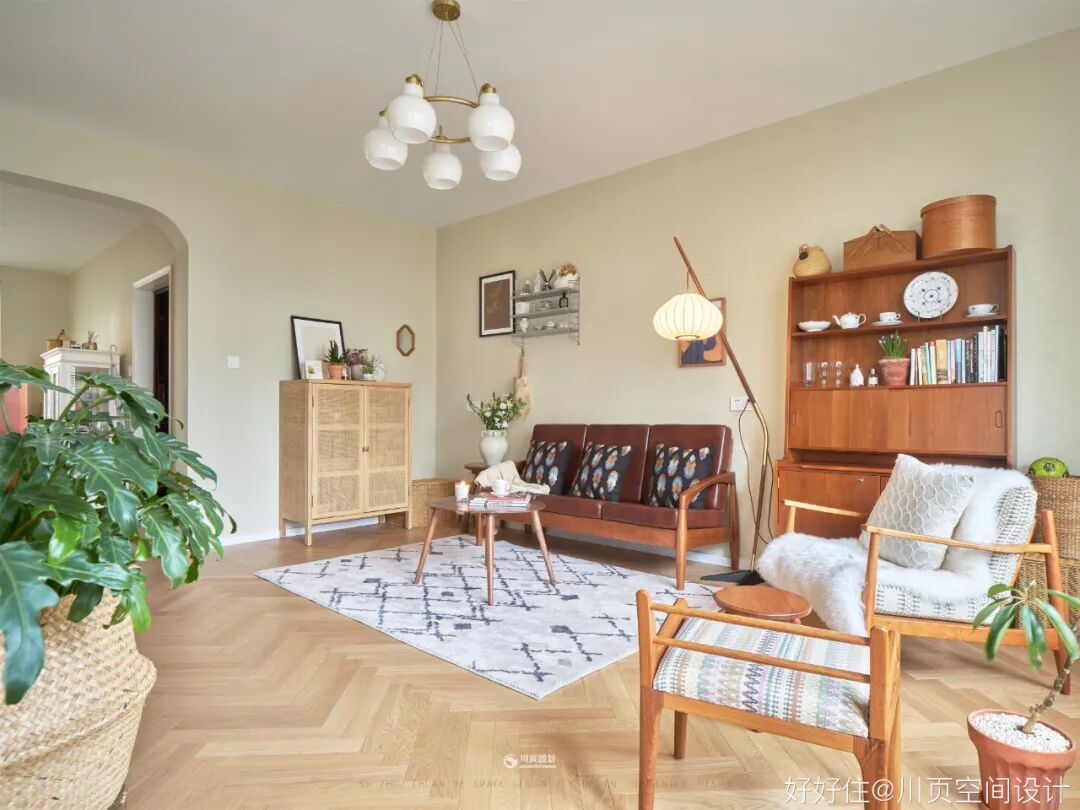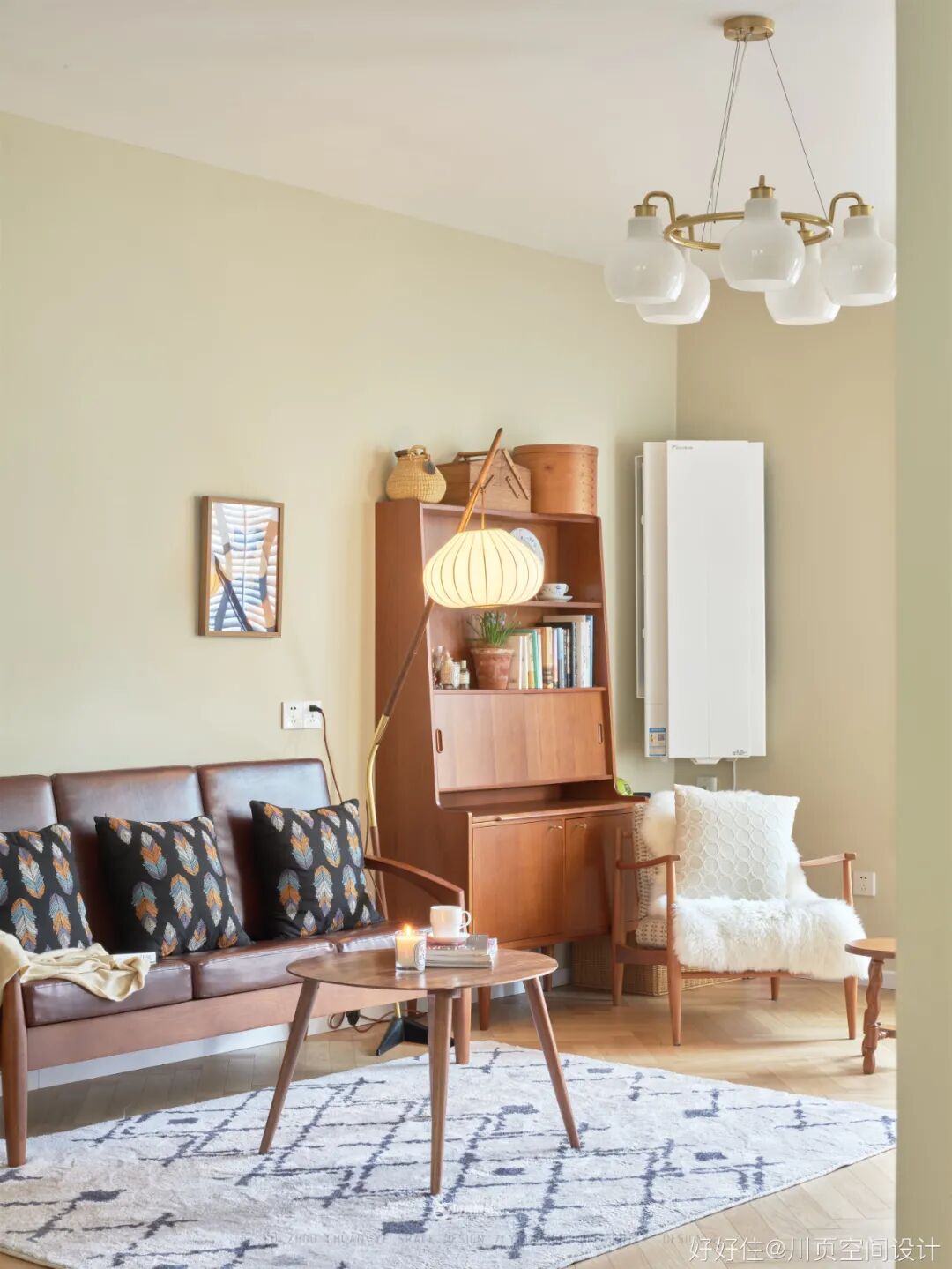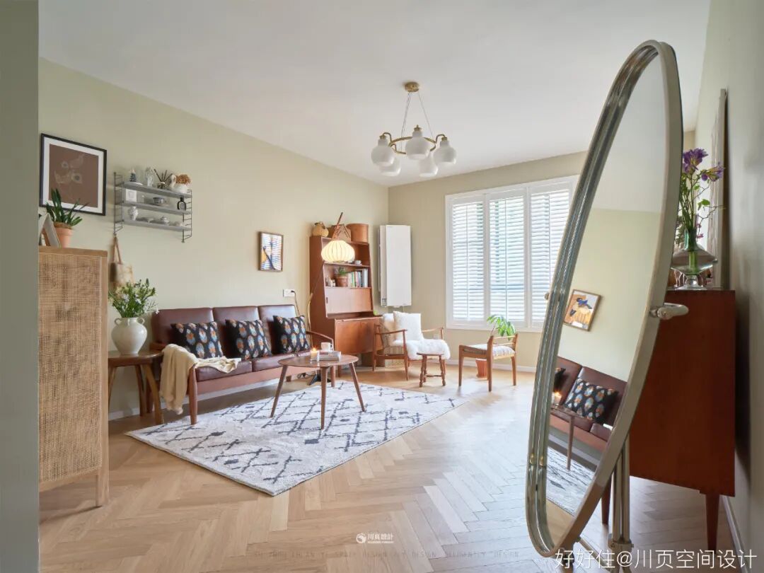 1.考虑到女主喜欢喝咖啡、看书等,客厅打破了传统的格局,无顶天立地的收纳柜、各种造型的电视背景墙、吊顶等,全屋留白且无造型,留出大量的空白让软装来点缀空间氛围,以北欧中古风家具+百叶窗打造了一个集休闲、学习为一体的休闲场所。