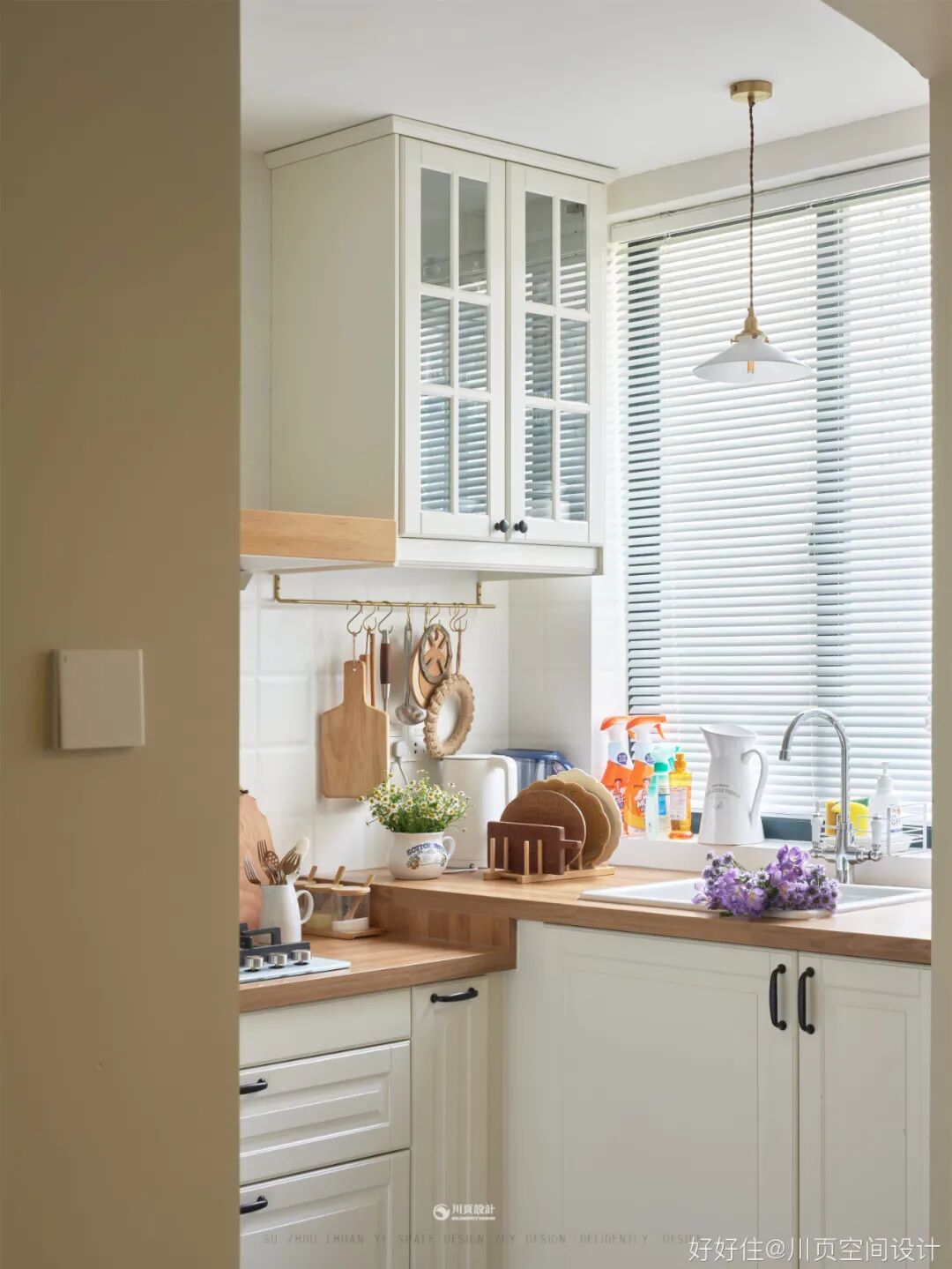 厨房和餐厅都采用了白色百叶窗,改变合页的角度,就能改变光线明暗,遮光非常好。厨房和餐厅都选用了丹麦设计师吊灯,优雅的圆盘灯罩下散发出微妙而又温暖的光线。晴天的时候,阳光透过百叶窗照在地板和灯上,整个空间的情调瞬间拉满。