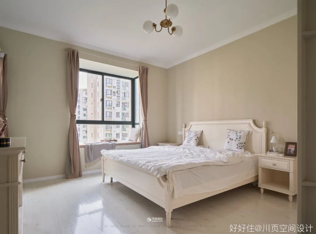 主卧,女主无法割舍原来的床和衣柜,因此,考虑到整个空间的协调性,除了墙面重新进行粉刷,床、衣柜、地板都沿用了原来的。对屋主来说,卧室就是睡觉的地方,因此整个空间没有任何多余的装饰。在布局上,原始户型主卧靠近阳台是扇窗,打掉换成门增强卧室采光,主卧可以直接出阳台,与客厅形成洄游动线,让整个空间更有趣。从阳台看主卧,空间明亮,采光充足。