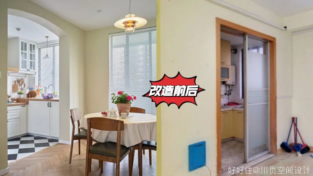 将厨房的墙体打掉后形成了一个开放式的烹饪空间,把厨房门洞做成一个与客厅的门洞相呼应的拱门,门洞无门套设计让厨房空间更有整体感,与地上的黑白瓷砖相搭配,增加了整体的复古调性和仪式感,同时还提升了两个空间的采光。