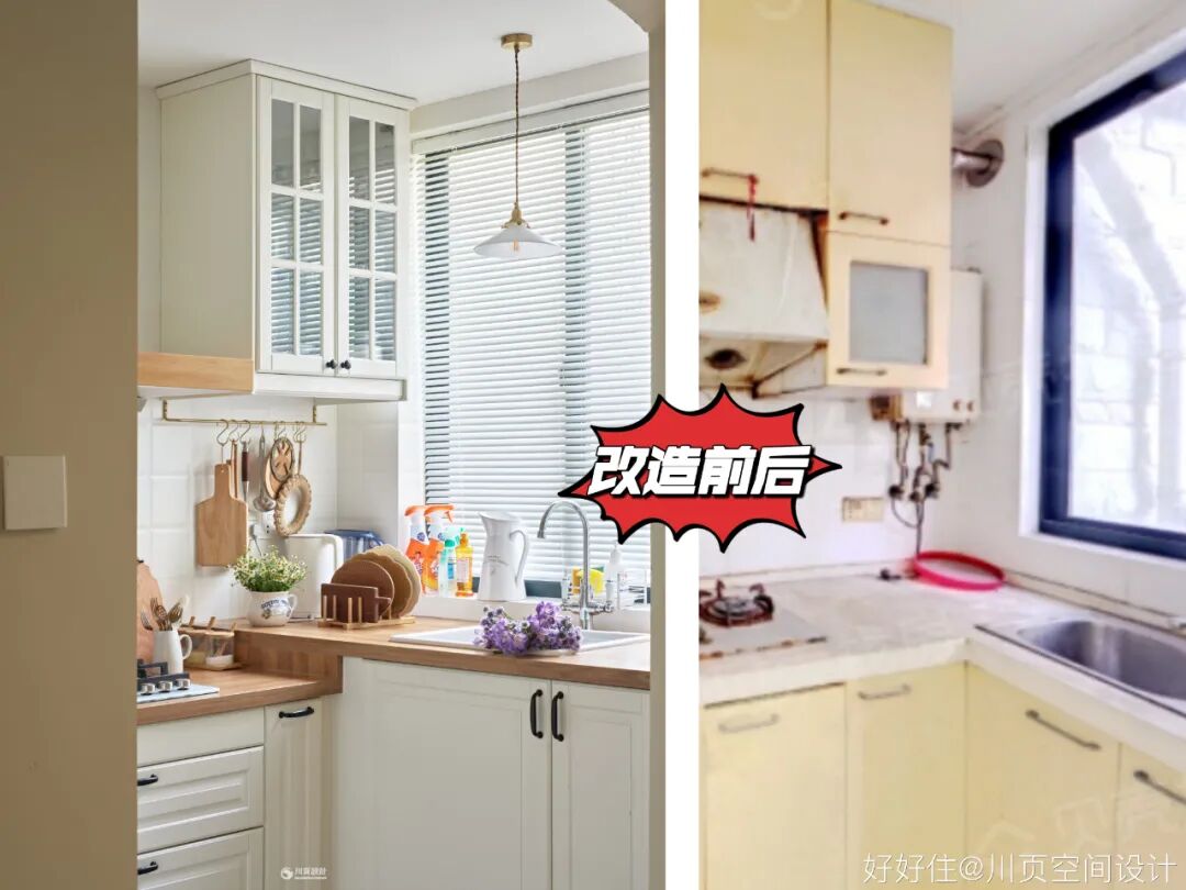 厨房选用白色+原木色的木质橱柜,没有过多的颜色碰撞,让整个空间更显明亮洁净。在布局上采用高低台设计,高柜90cm,矮柜80cm,经过计算的高度,炒菜、洗菜都不用弯腰。厨房整体画面极度舒适,一个能治愈所有强迫症的完美厨房空间。