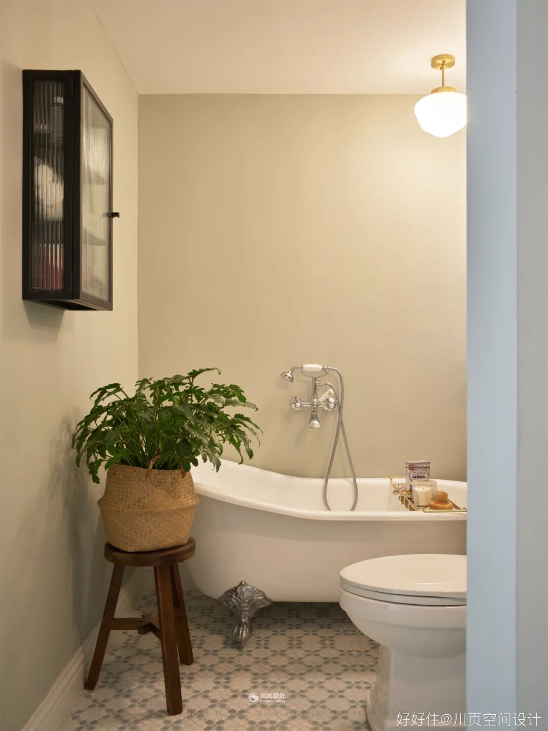 主卧的卫生间空间非常小,只有3平方米,而且采光不好,考虑到空间的逼仄感和潮湿,整个空间采用浅色调。在储物上,选用了轻巧的吊柜+隔板的形式,隔板主要用于摆放洗漱用品,吊柜主要用于存放纸巾等需要防潮的用品,同时减少了卫生死角。