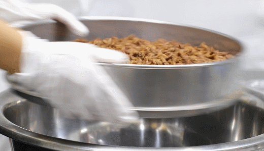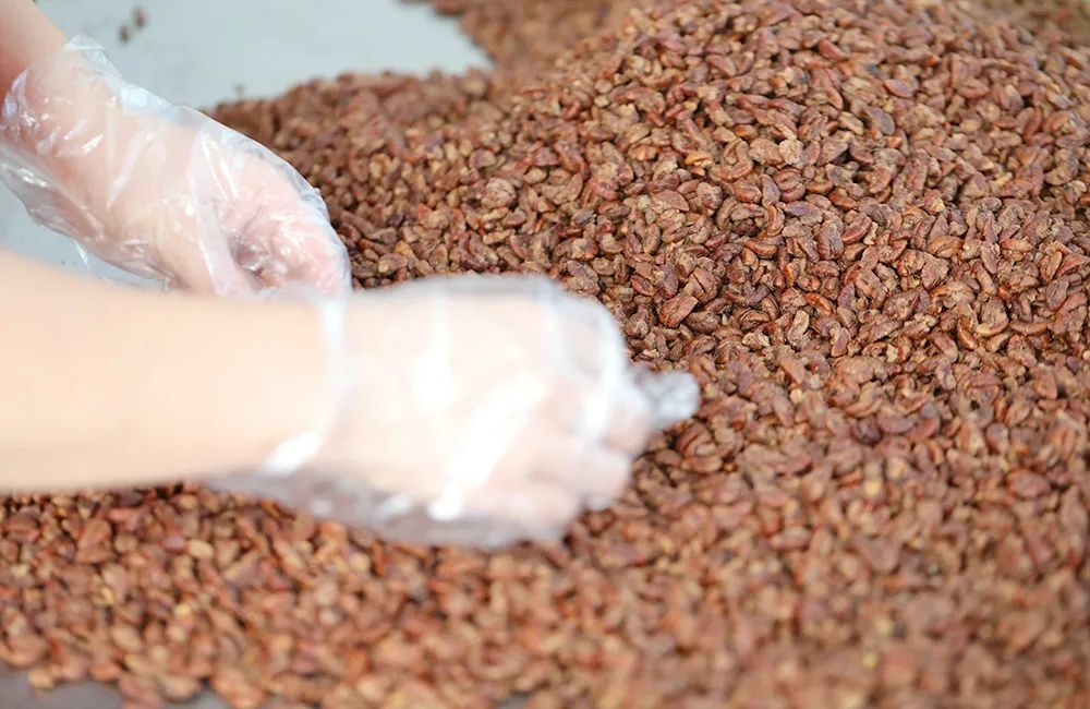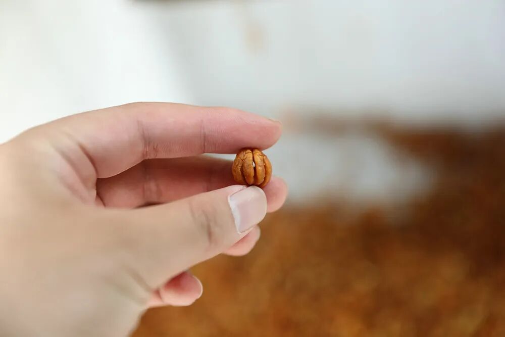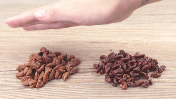 再用筛孔大于4毫米的筛子将6%~8%的碎仁筛出,力求让大家吃到完整、酥脆的山核桃果仁。