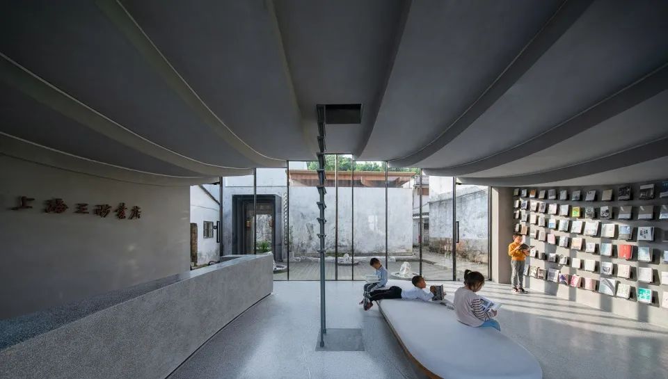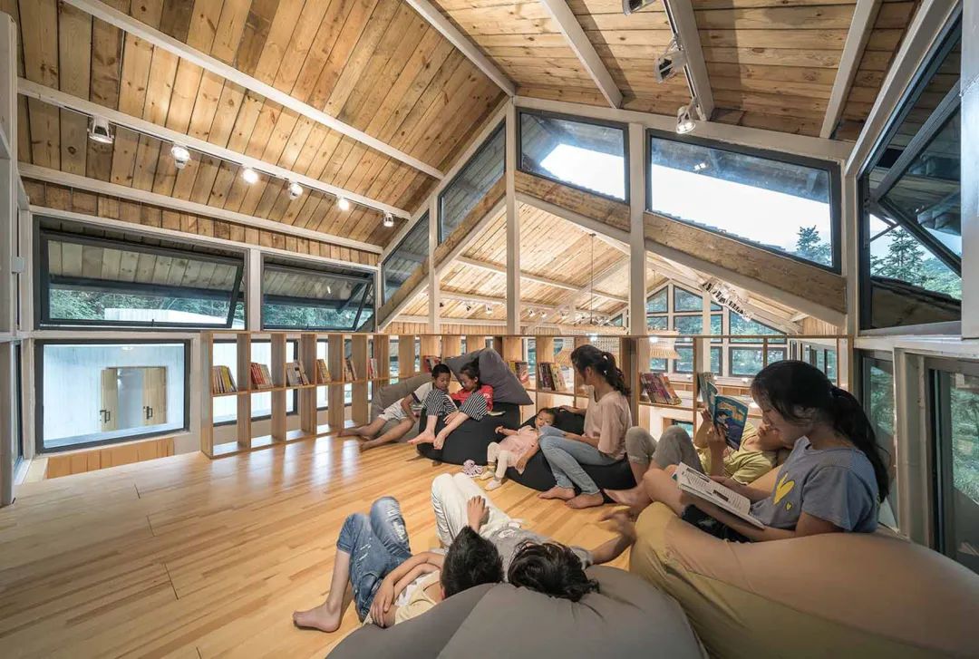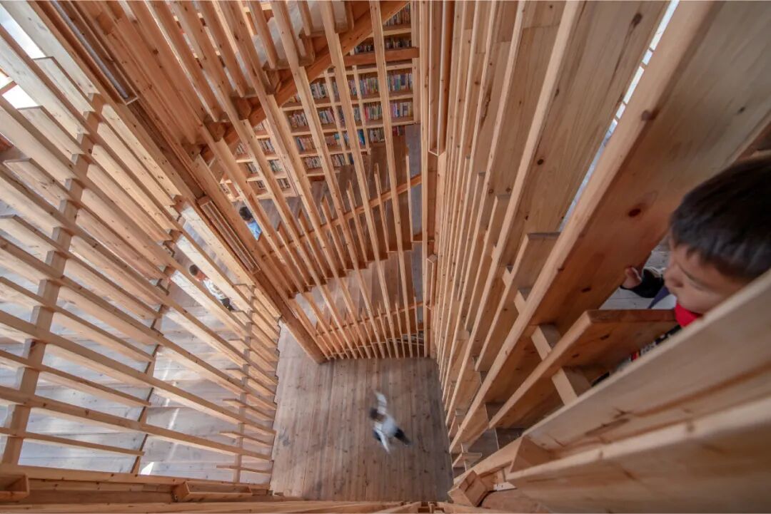 试想象,在一个传统的木构房屋中嵌入了一个无止境的楼梯,一个由踏板组成的、无限延伸的环。为了增加神秘感,这个楼梯并没有目的地,它就是目的地本身。建筑的外墙由书架和可以俯瞰庭院的窗户组成的矩阵组成。坪坦书屋不应被定义为一个传统的儿童图书馆,而是一个可以让孩子们一边读书一边玩耍的地方。这也是中国乡村图书馆的新范式。